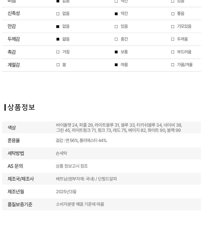 색상 : 바이올렛(24),퍼플(29),라이트블루(31),블루(33),터키쉬블루(34),네이비(38),그린(45),라이트핑크(71),핑크(73),레드(75),베이지(82),화이트(90),블랙(99)