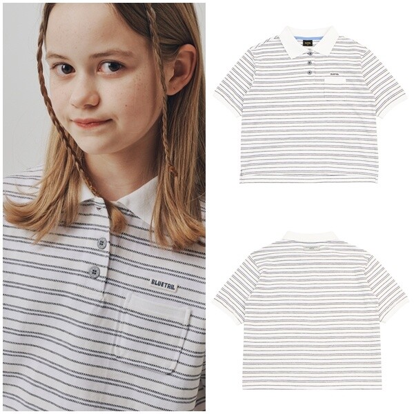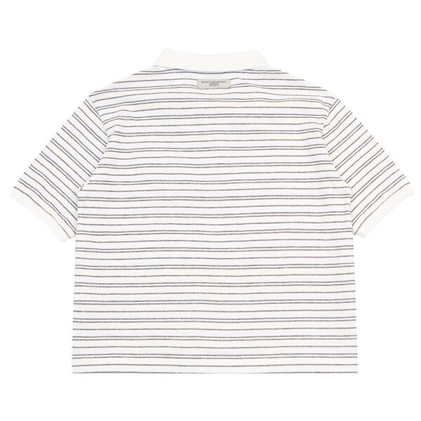 컬러 믹스와 피케 조직이 빈티지한 느낌을 주는 화이트 스트라이프 카라 티셔츠입니다.