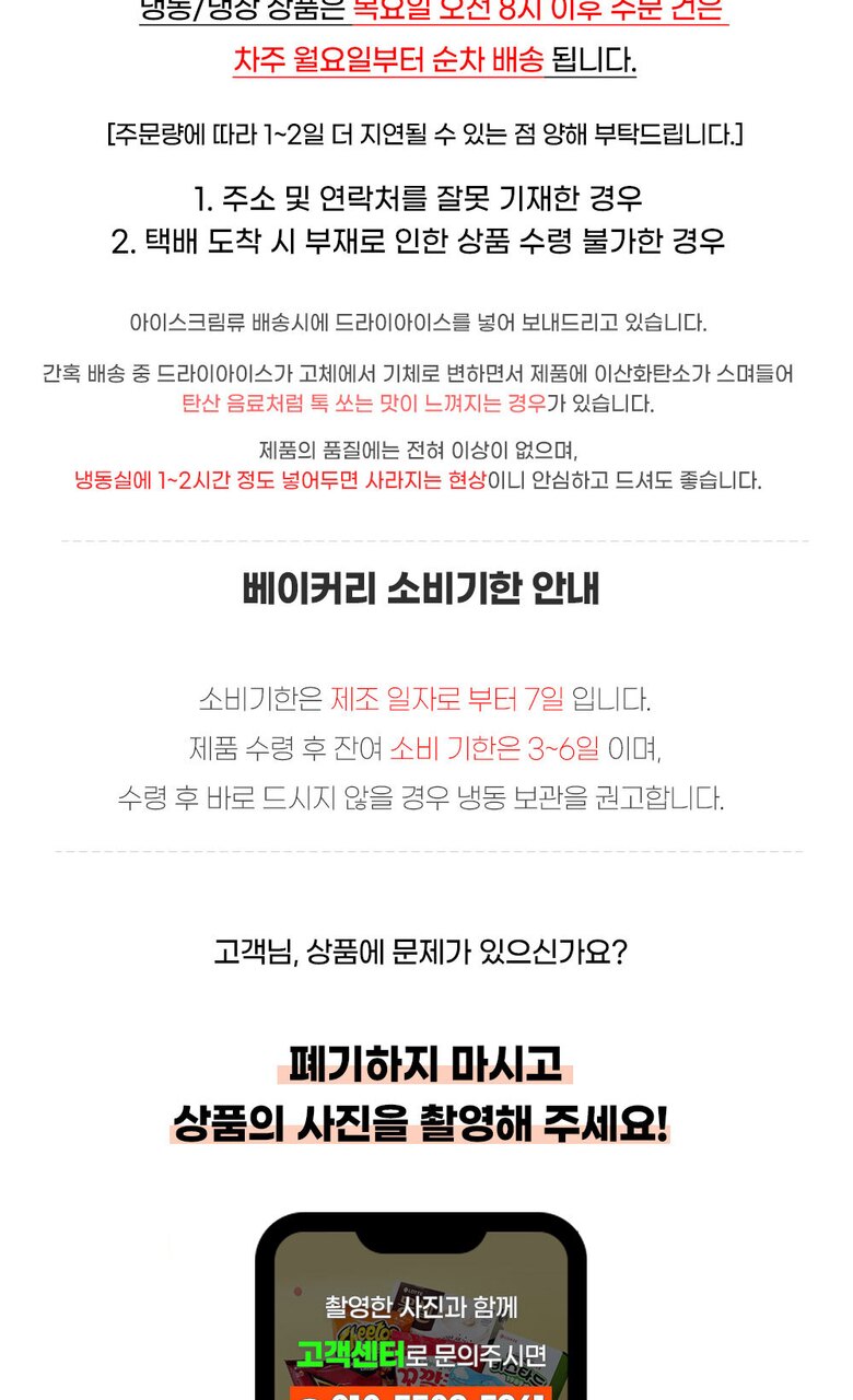 | 4. 생산일자,유통기한 | 1.냉장:상시제조/소비기한은 제조 일자로부터 7일 입니다.2.실온/냉동 제조연월일 :상시 제조 상품으로 잔여 소비기한이 3분의 1이상인 제품으로 출고되고 있으며, 소비 기한이 비교적 짧은 제품은 최소 13달이상 남은 제품으로 출고됩니다. |