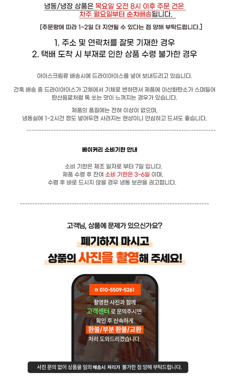 | 4. 생산일자,유통기한 | 1.냉장:상시제조/소비기한은 제조 일자로부터 7일 입니다.2.실온/냉동 제조연월일 :상시 제조 상품으로 잔여 소비기한이 3분의 1이상인 제품으로 출고되고 있으며, 소비 기한이 비교적 짧은 제품은 최소 13달이상 남은 제품으로 출고됩니다. |