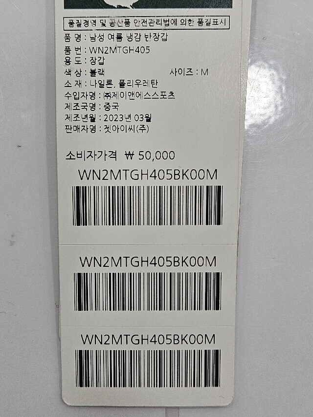 WN2MTGH405 BK 여름 남성 냉감 반장갑