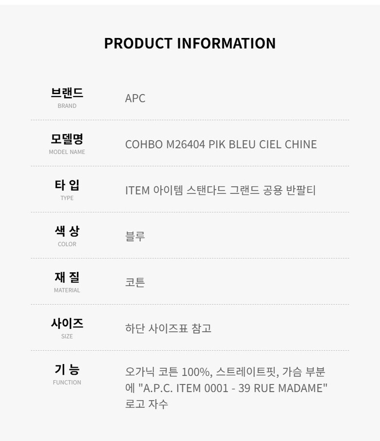 아페쎄 반팔 COHBO M26404 PIK BLEU CIEL CHINE 아이템 스탠다드 그랜드 남성반팔티 여성반팔티 당일발송