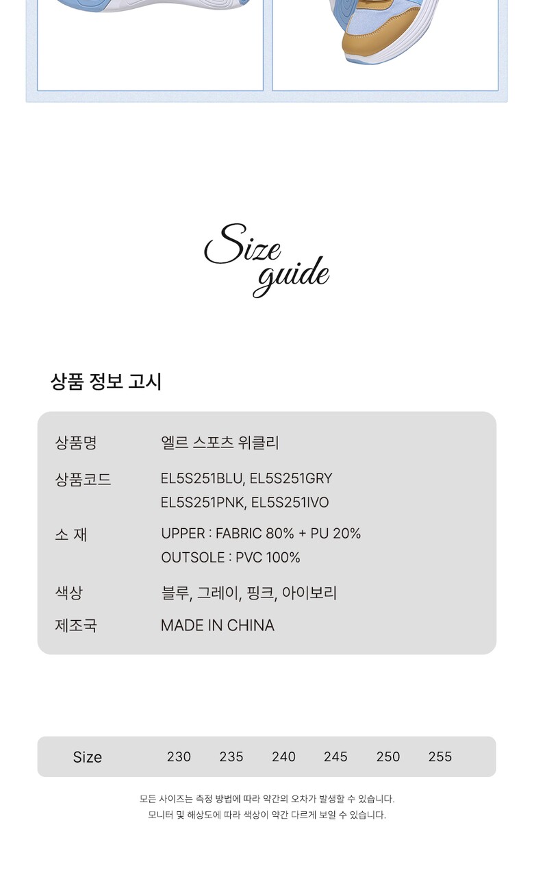 | 1. 제품 소재 (운동화인 경우에는 겉감, 안감을 구분하여 표시) | 상세페이지 참조 |