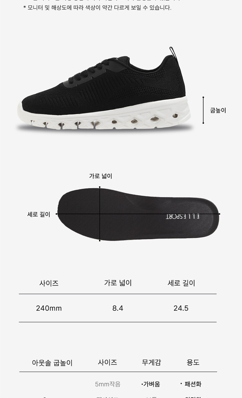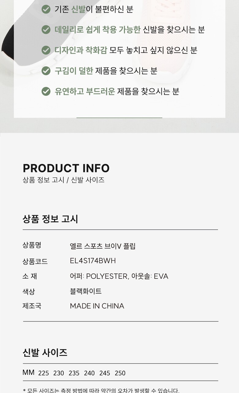 | 1. 제품 소재 (운동화인 경우에는 겉감, 안감을 구분하여 표시) | 상세페이지 참조 |