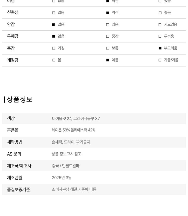 1. 제품 소재 (섬유의 조성 또는 혼용률을 백분율로 표시, 기능성인 경우 성적서 또는 허가서) 레이온58%,폴리에스터42%