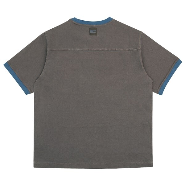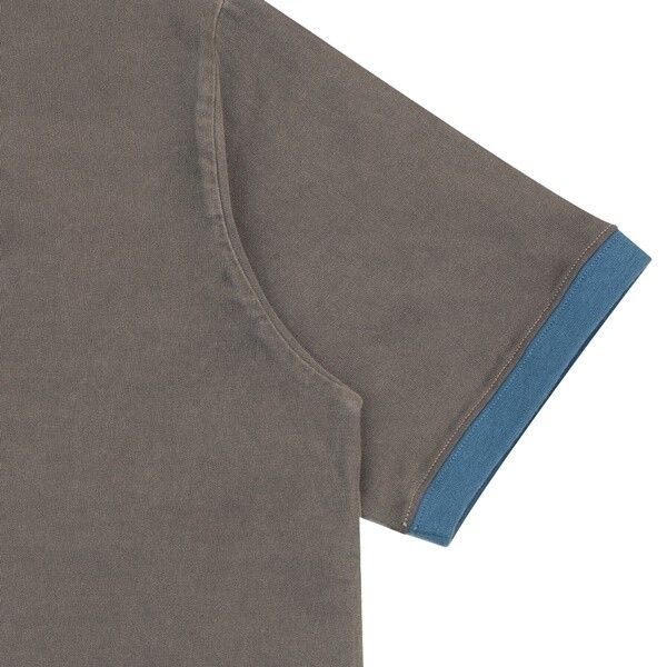 넥라인과 소매 끝단에 스카이블루 배색이 들어간 브라운 컬러 링거 티셔츠입니다.