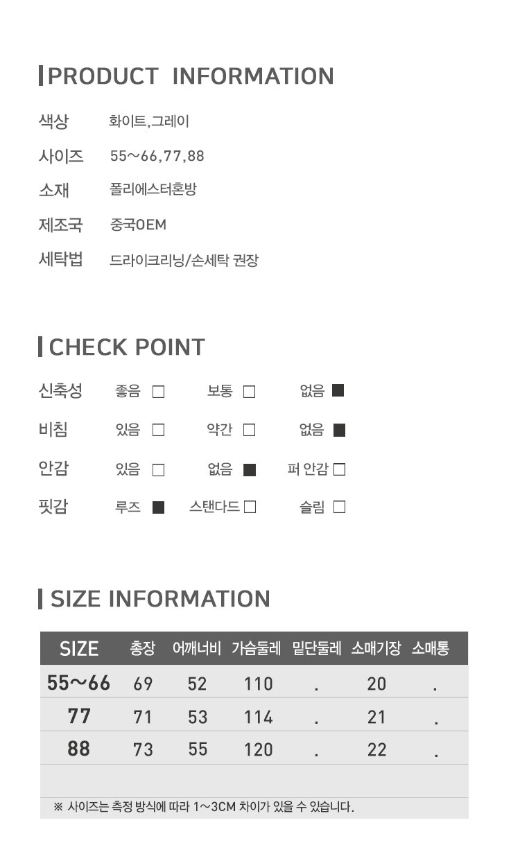 | 1. 제품 소재 (섬유의 조성 또는 혼용률을 백분율로 표시, 기능성인 경우 성적서 또는 허가서) | 상세페이지참고 |