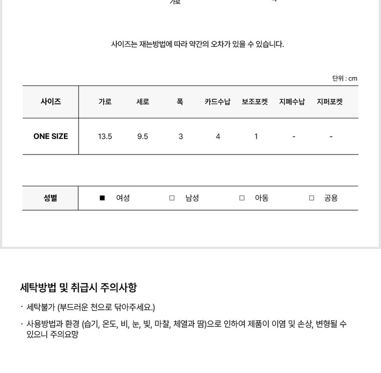 3. 치수 | 가로 13.5 cm x 세로 9.5 cm x 폭 2 cm |