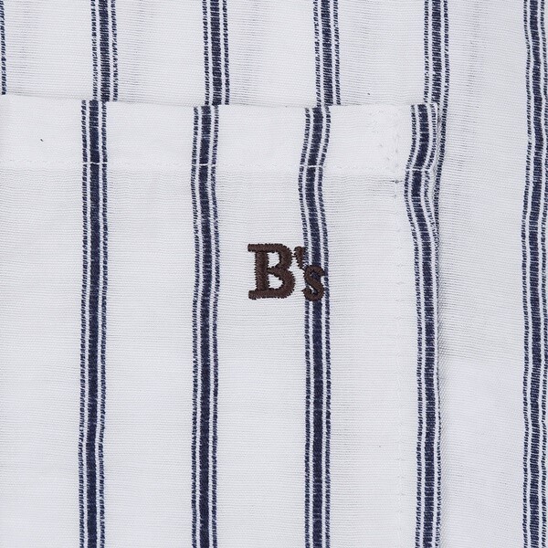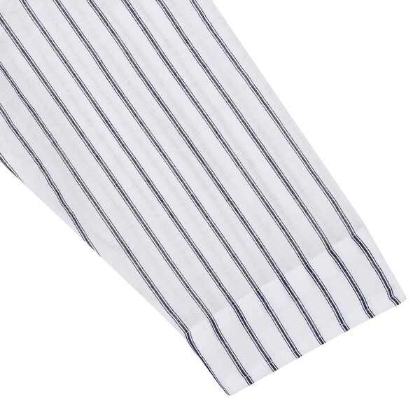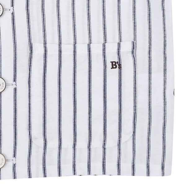 화이트, 네이비 스트라이프 패턴이 리조트한 여름 분위기를 보여주며, 이너로 브라운 티셔츠 또는 스카이 블루 티셔츠와 함께 입고 같은 소재를 배색 디자인한 BZ31PT01WT와 셋업하여 세련되고 시원한 여름 타운 캐주얼 스타일링을 할 수 있습니다.?