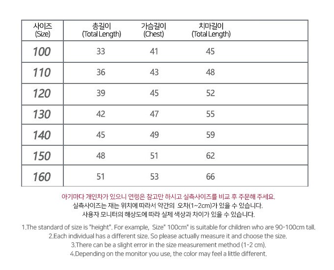 사이즈 : 100,110,120,130,140,150,160