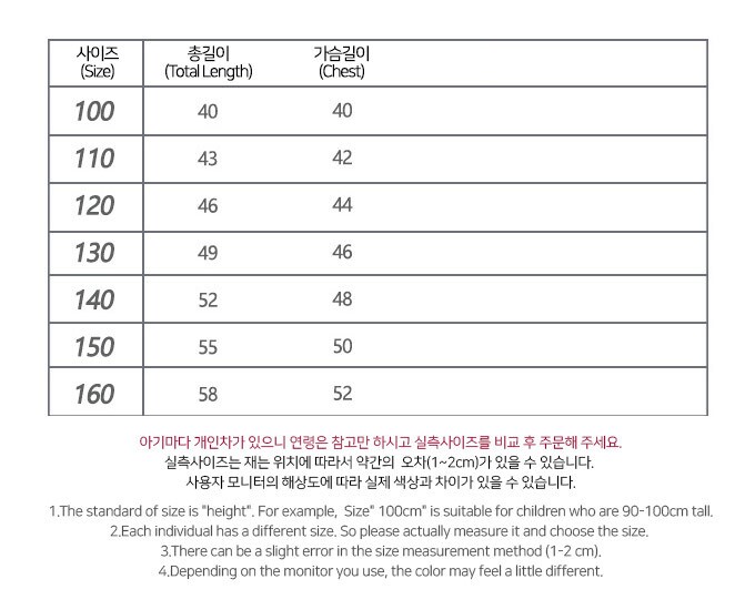 사이즈 : 100,110,120,130,140,150,160