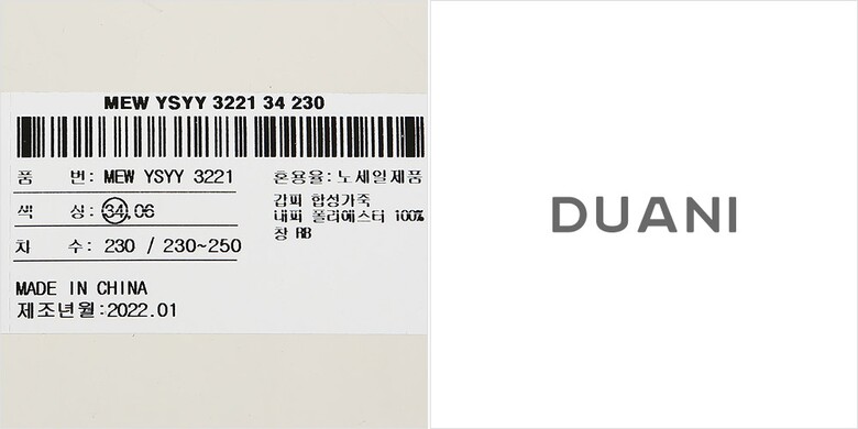 1. 제품 소재 (운동화인 경우에는 겉감, 안감을 구분하여 표시) | 갑피:합성가죽 내피:폴리에스터100% 창:RB |