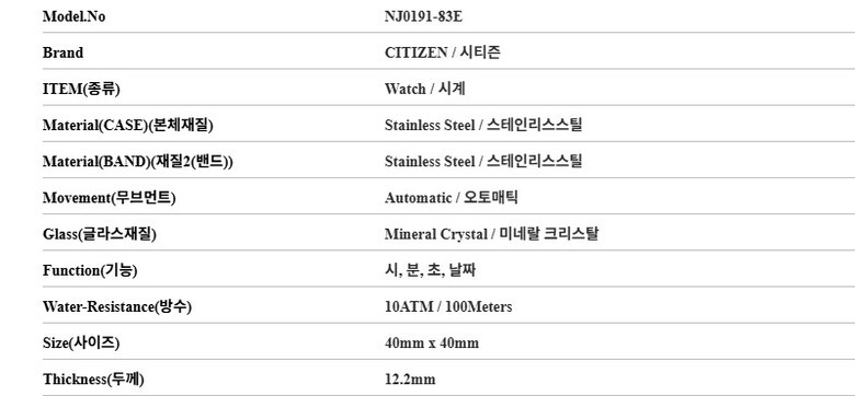 시티즌 NJ0191-83E 남성 오토매틱 메탈 시계
