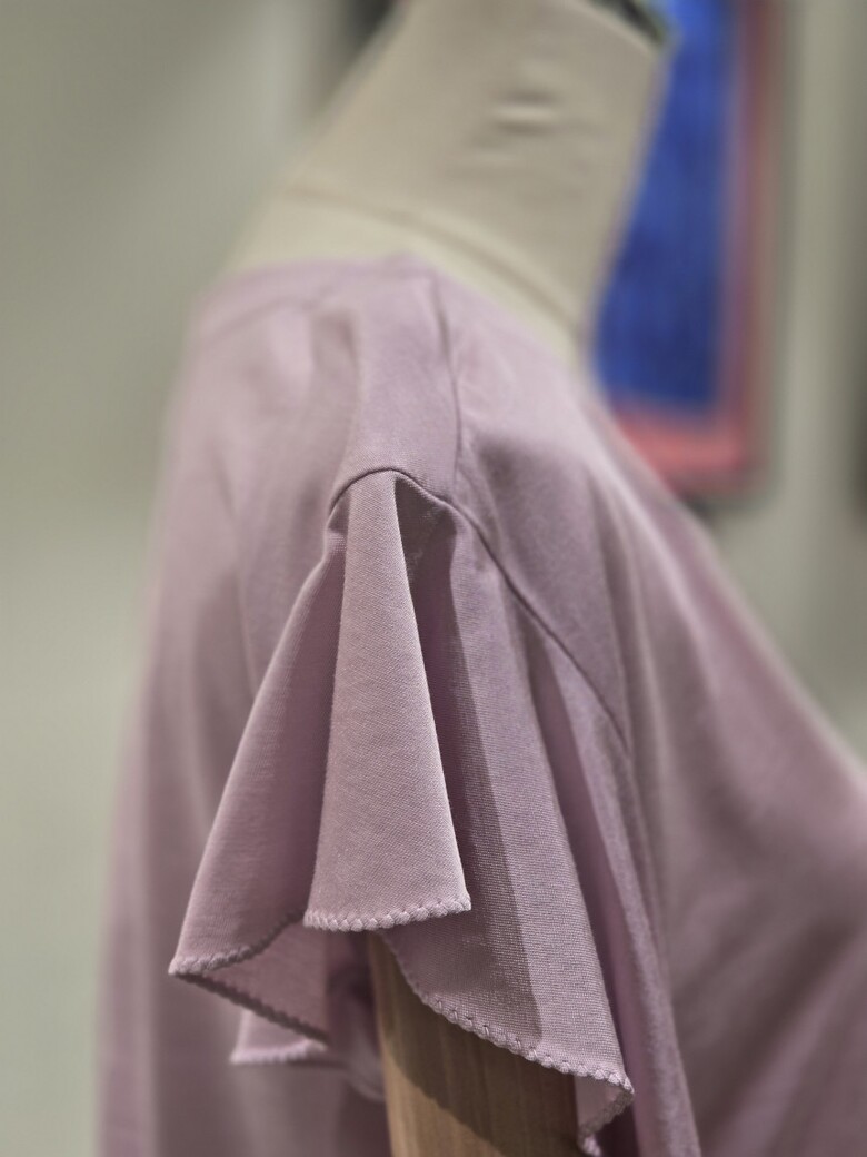 소매와 밑단의 러플 포인트가 여성스러운 분위기를 연출해 줍니다.