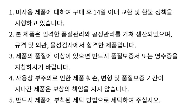 상품불량에 의한 반품, A/S, 품질보증 및 피해보상 등에 관한 사항은 소비자 분쟁해결기준(공정거래위원회 고시) 구매자가 미성년자인 경우에는 상품 구입시 법정대리인이 동의하지 아니하면 미성년자 본인 또는 법정대리인이 구매취소 할 수 있습니다. |