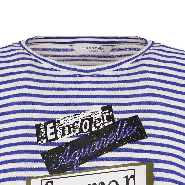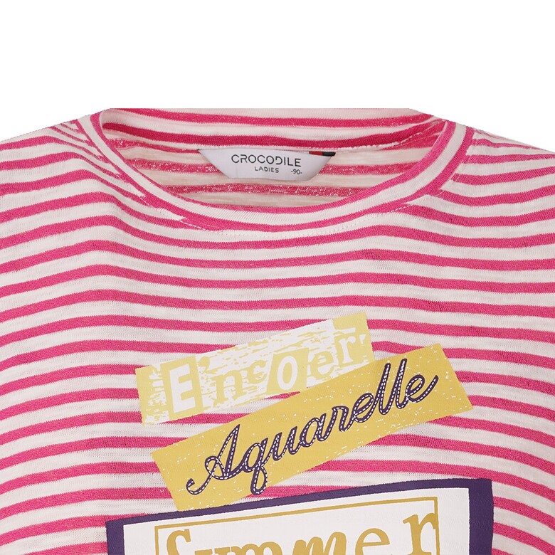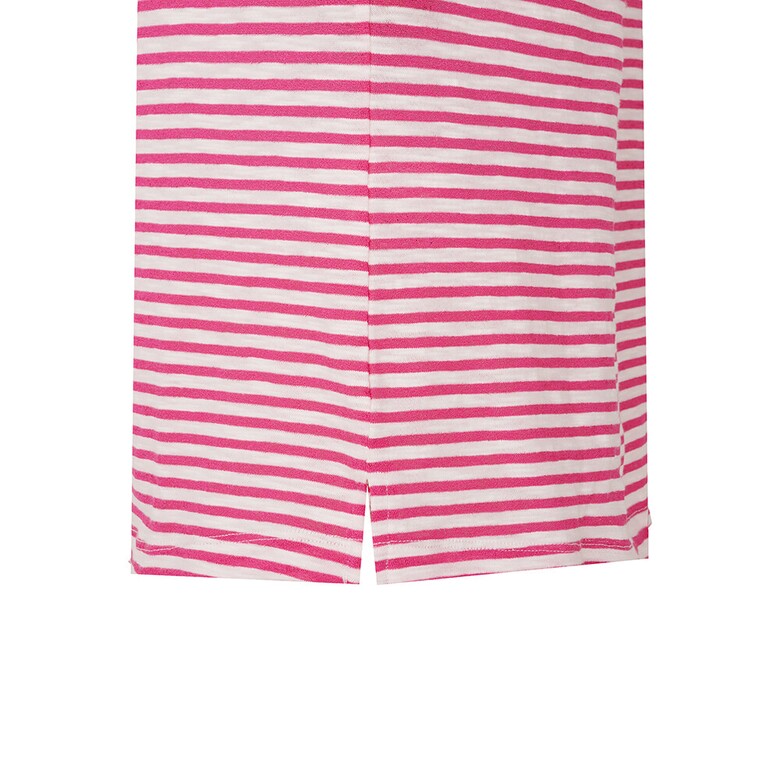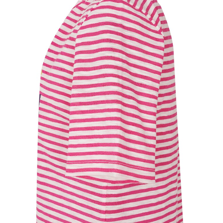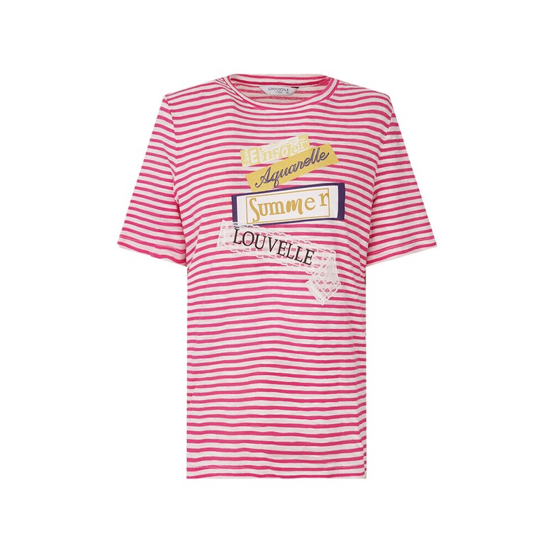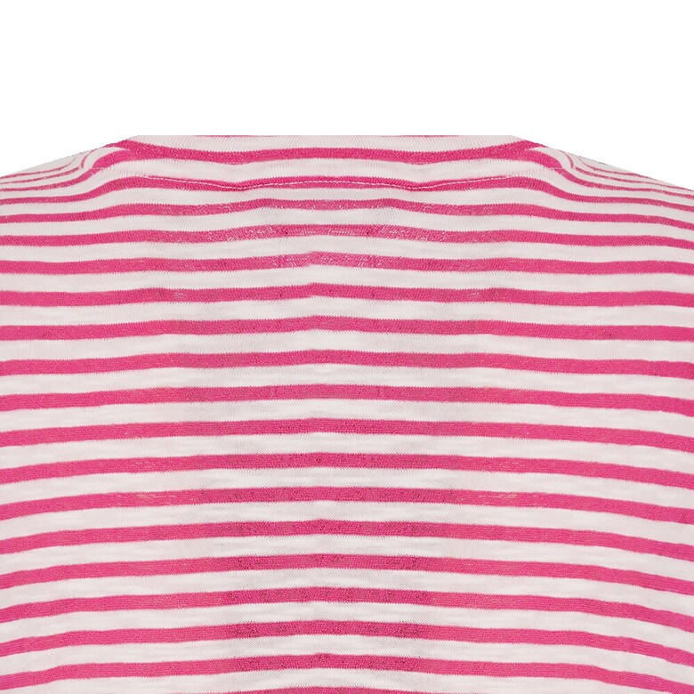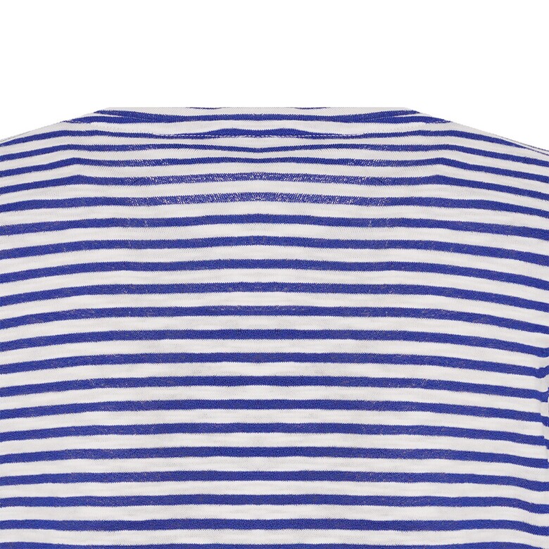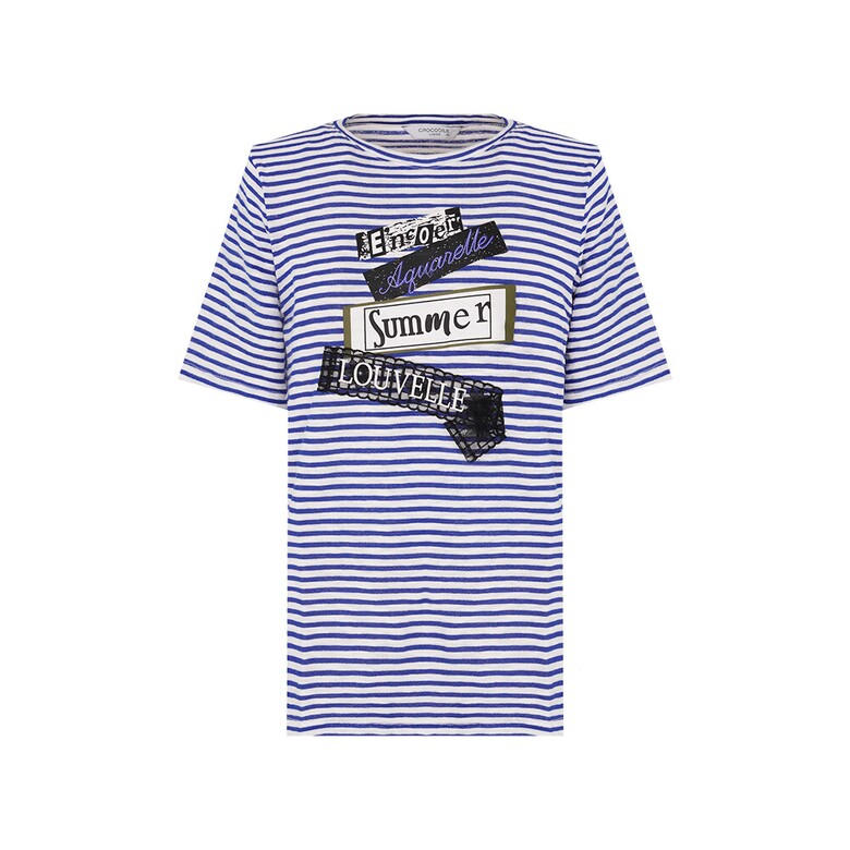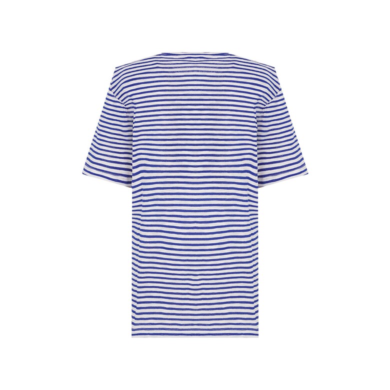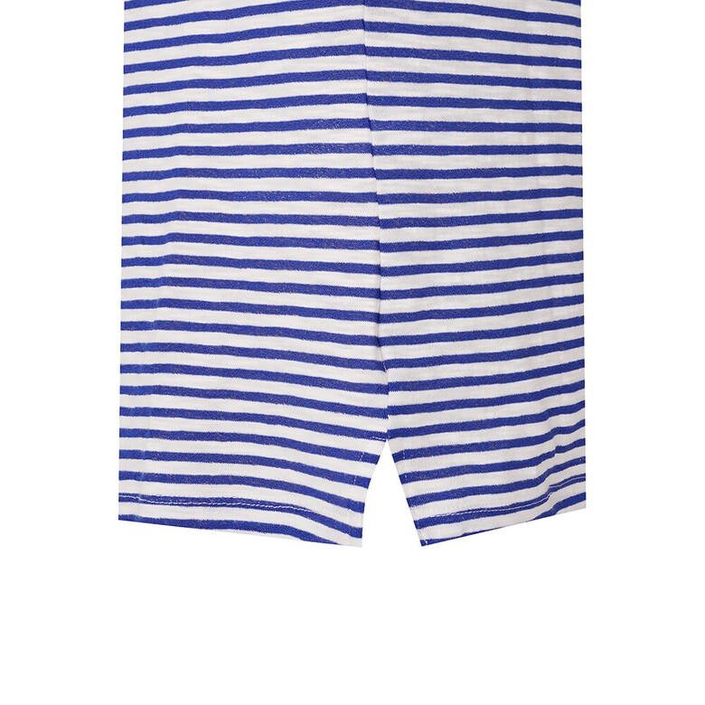 간결한 라운드넥 디자인의 스트라이프 티셔츠로 앞판에 레이스가 포인트로 들어간 아트웍이 여성스러움을 돋보이게 하며 여유로운 핏으로 편안한 착용감이 가능한 아이템