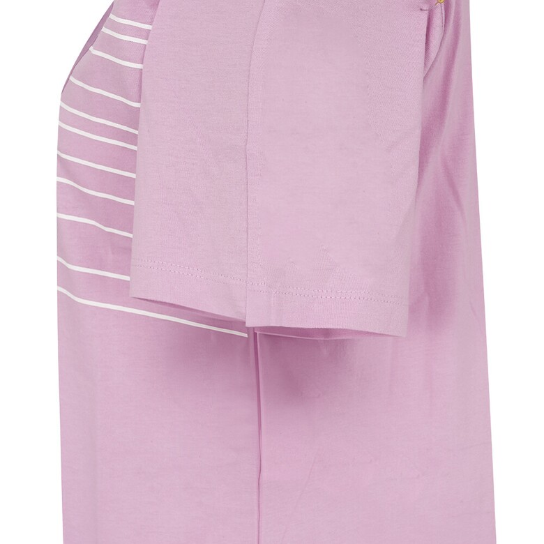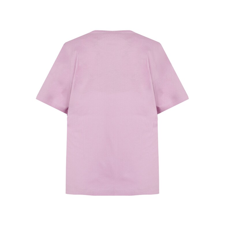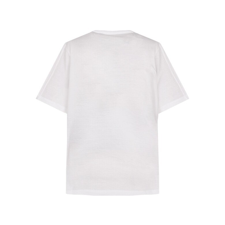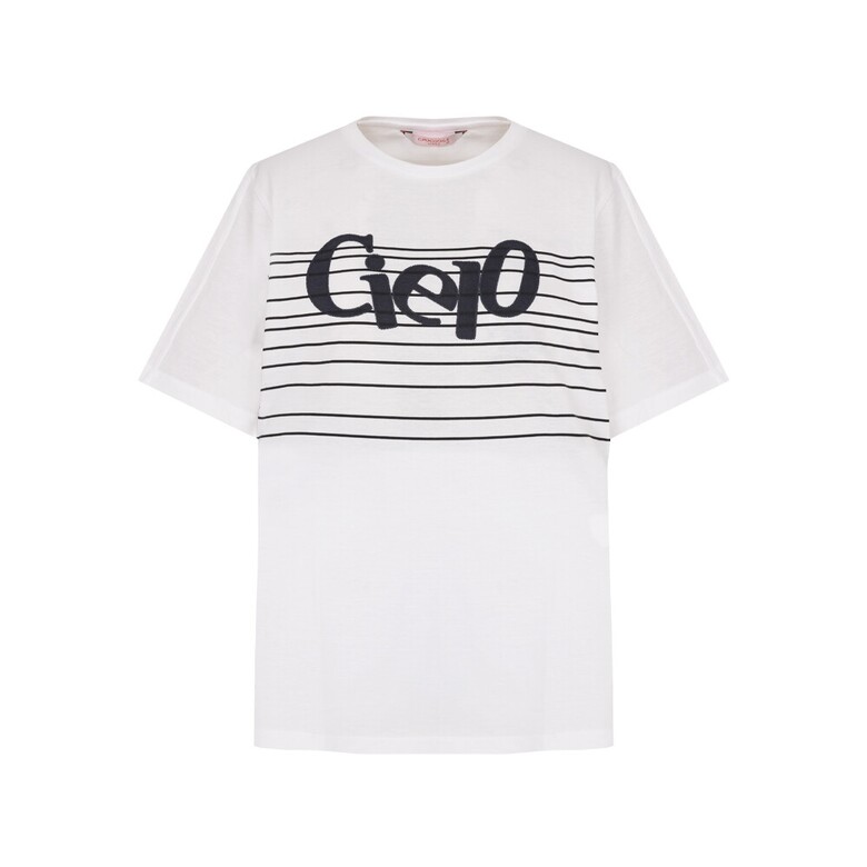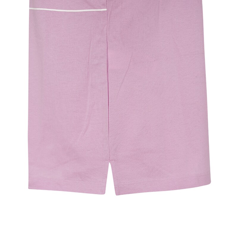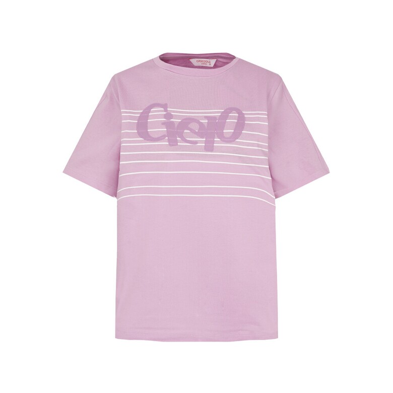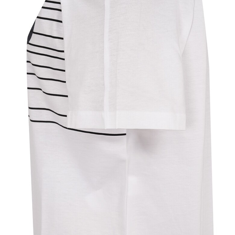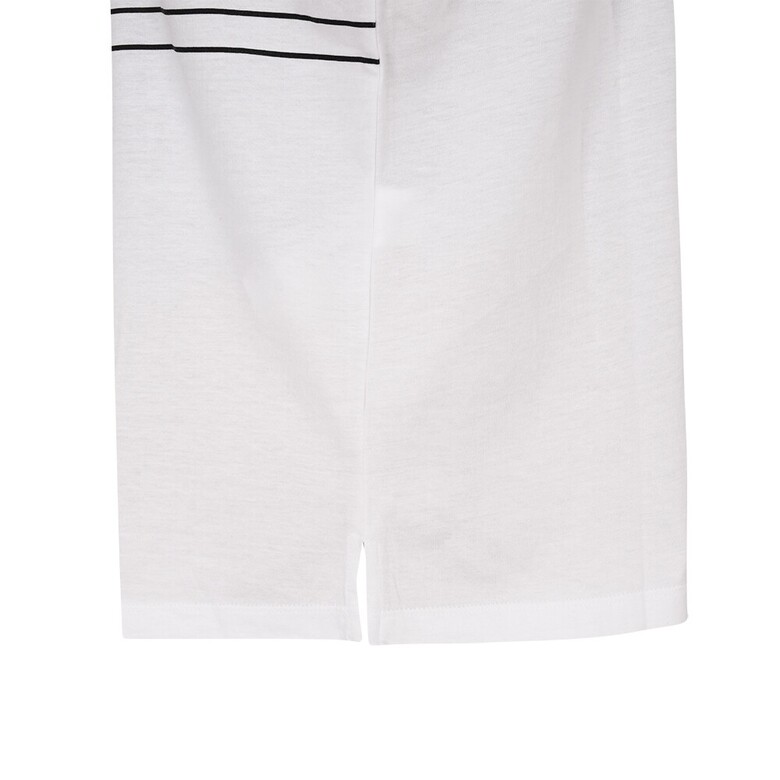 면실켓 소재를 사용하여 부드럽고 탄탄하며 여성스러운 실루엣과 앞판 스트라이프 로고 프린트가 포인트인 캐주얼 티셔츠