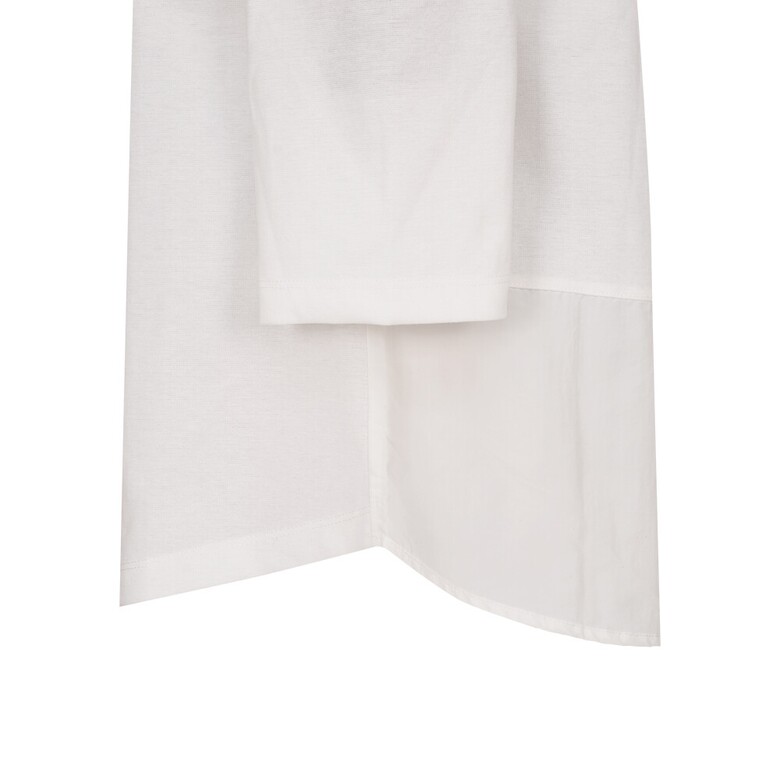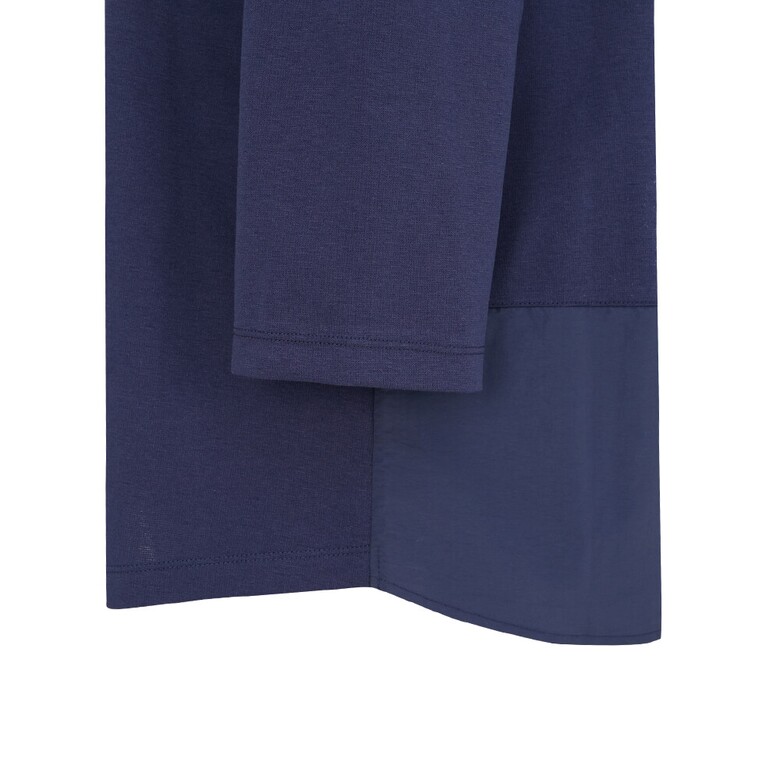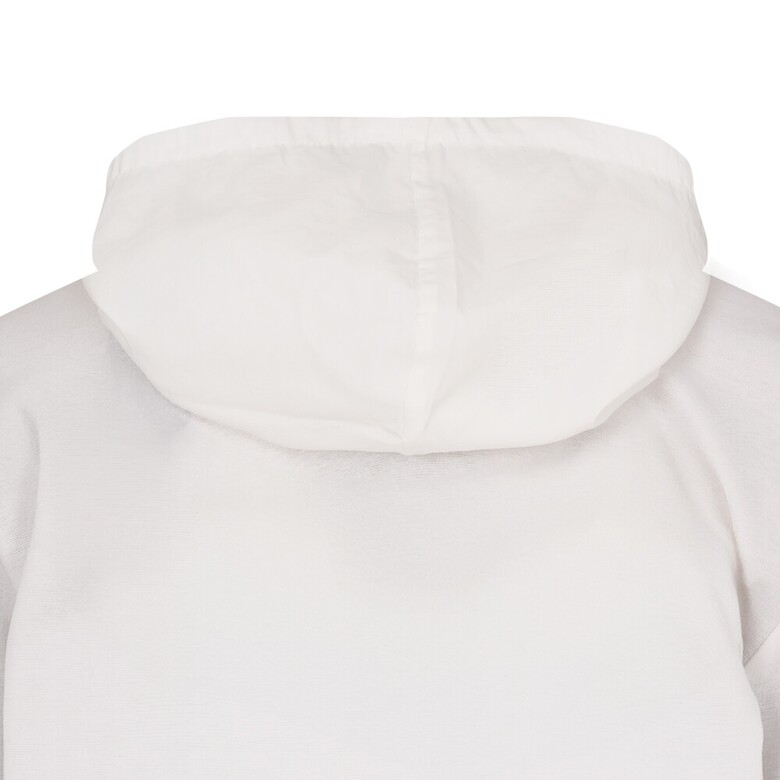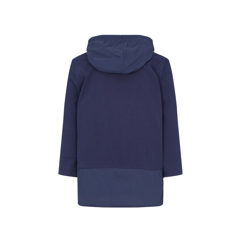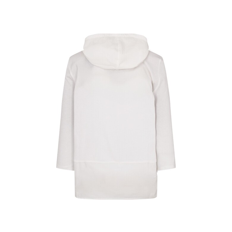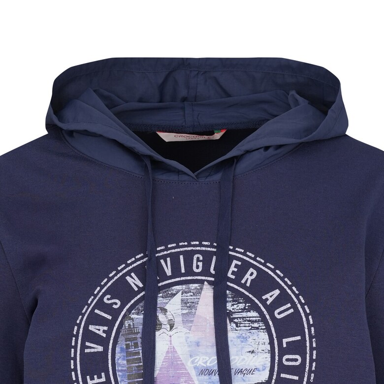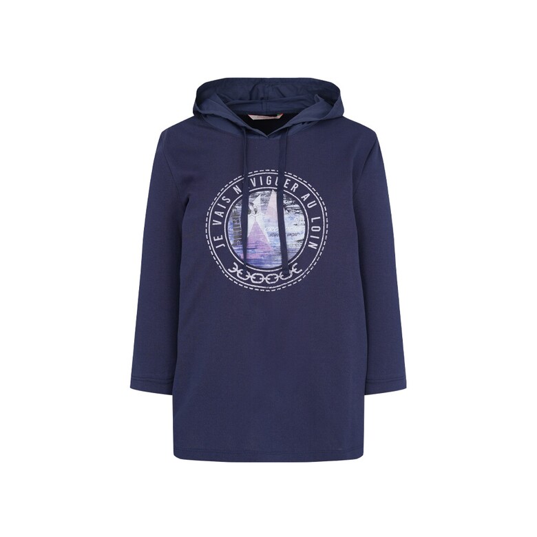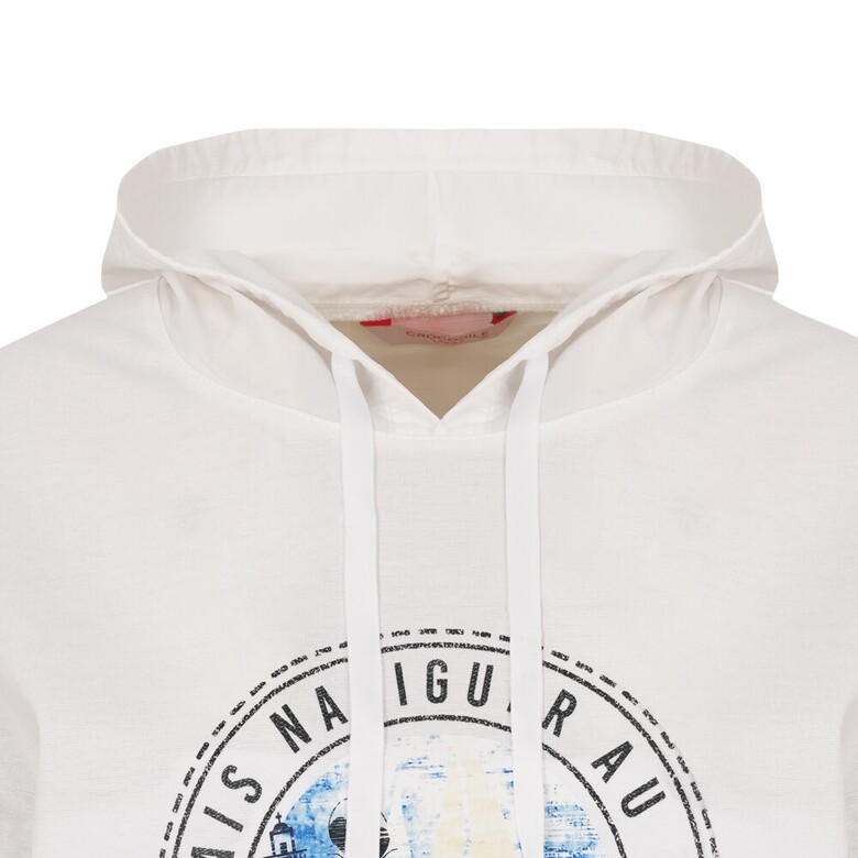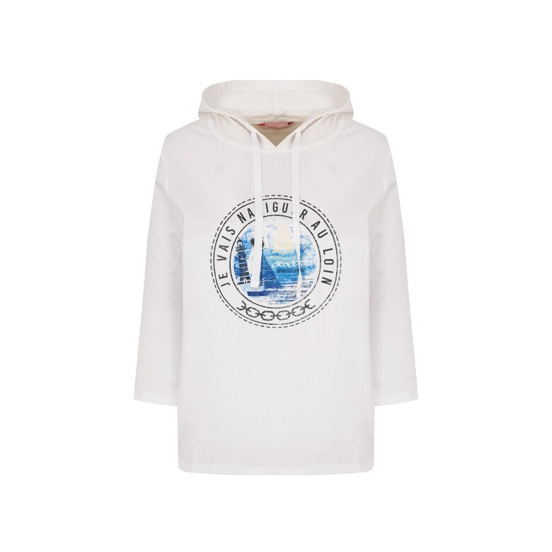 폴리와 면혼방 분또와 우븐소재를 믹스하여 사용하였고 앞판 바다여행 느낌의 프린트가 포인트인 편안한 실루엣의 캐주얼 후드형 7부 티셔츠