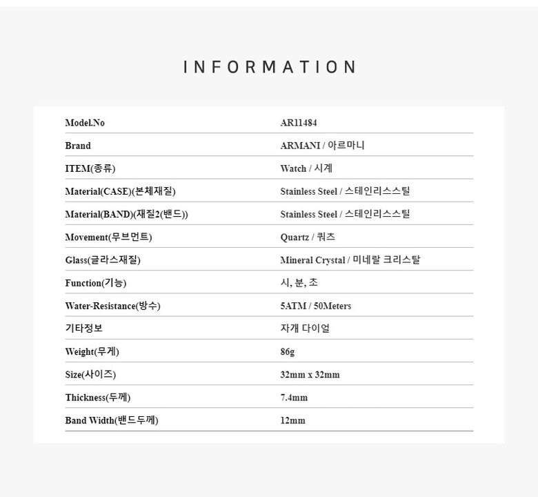 | 1. 소재 / 순도 / 밴드재질 | 실버/ 케이스 - 스테인리스스틸 / 밴드 - 스테인리스스틸 |