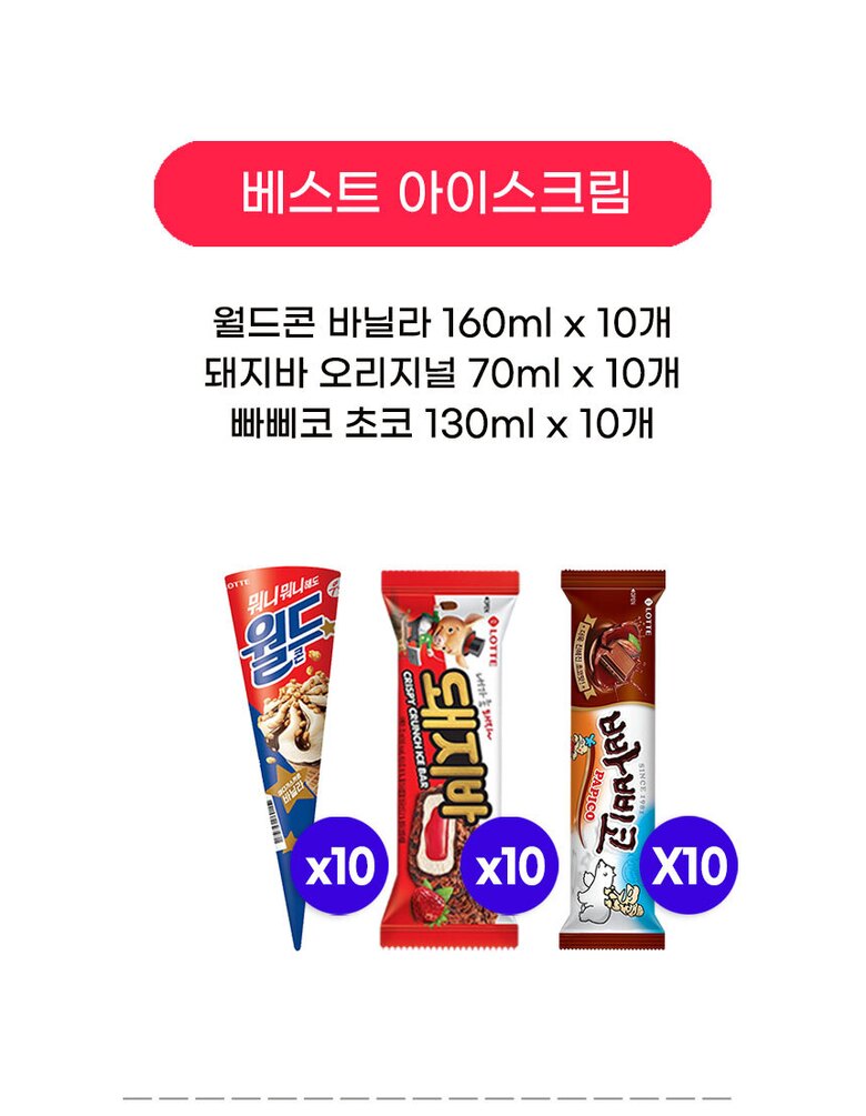 [롯데] 베스트 아이스크림 30개 세트(월드콘 10,돼지바 10, 빠삐코 10)