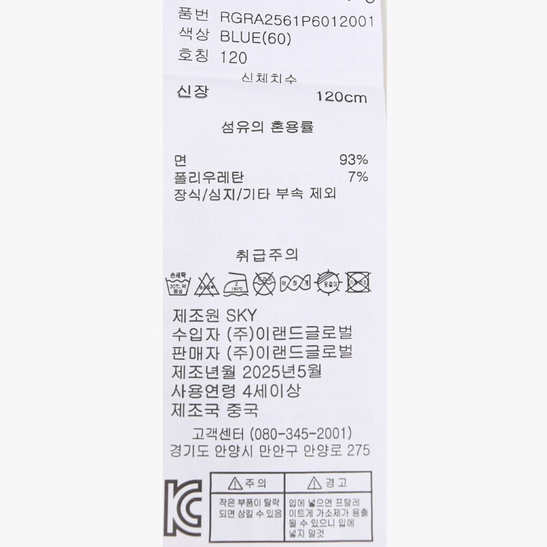 | 1. 제품 소재 (섬유의 조성 또는 혼용률을 백분율로 표시, 기능성인 경우 성적서 또는 허가서) | 상품상세참조 |