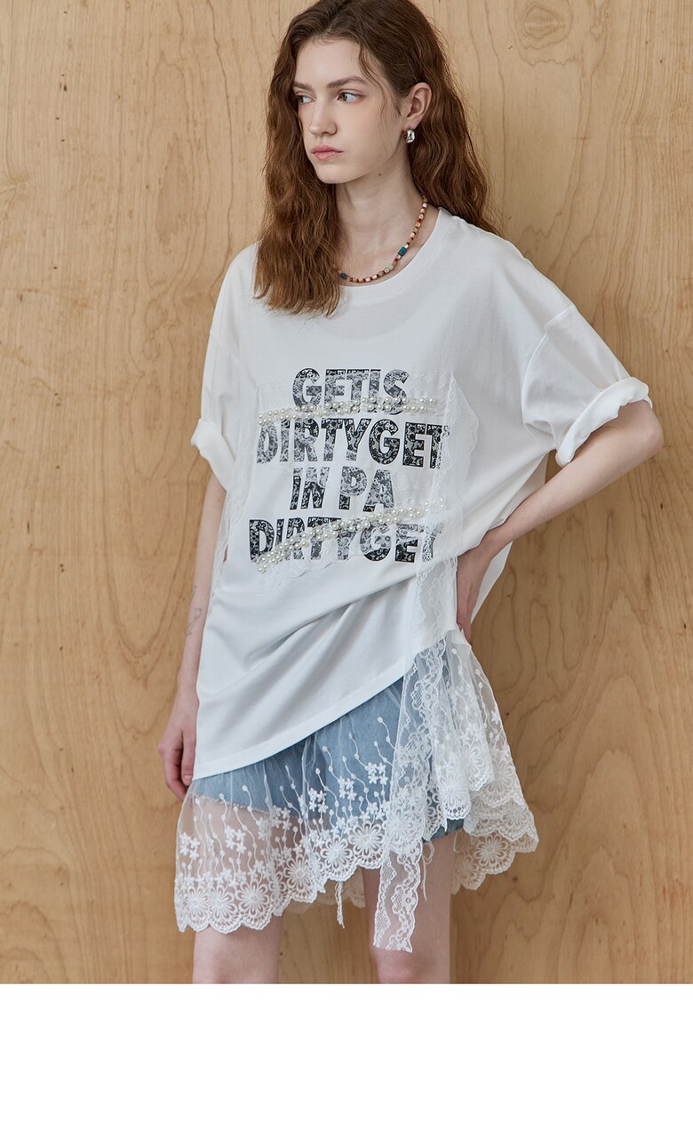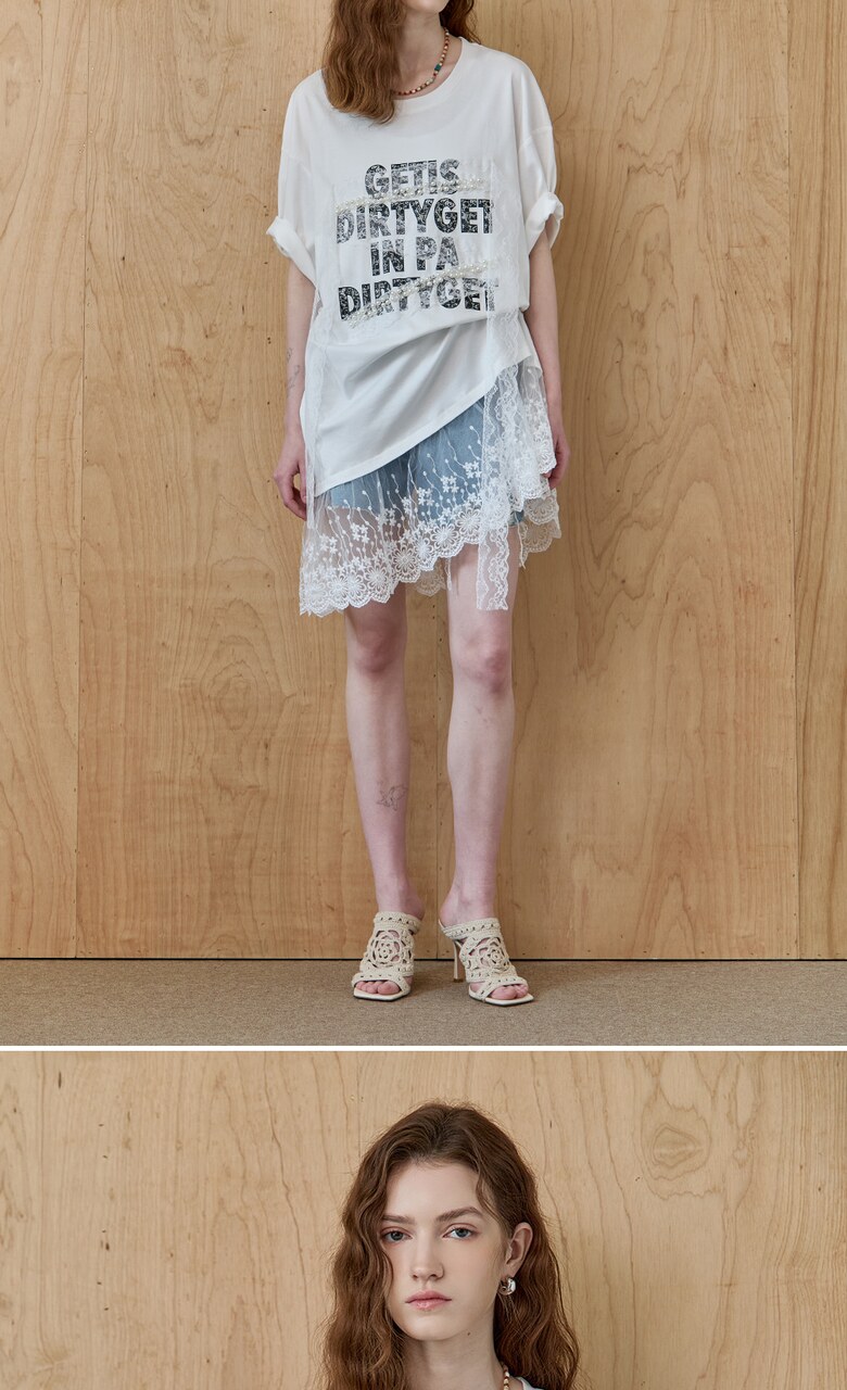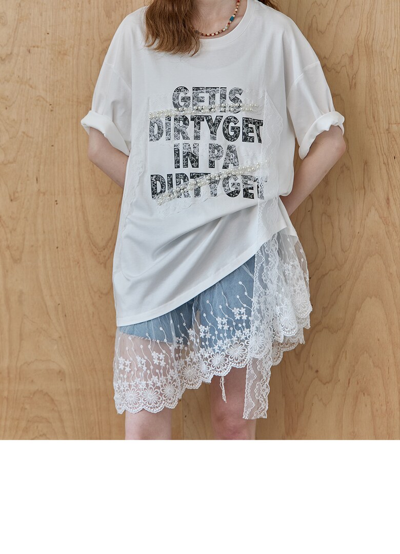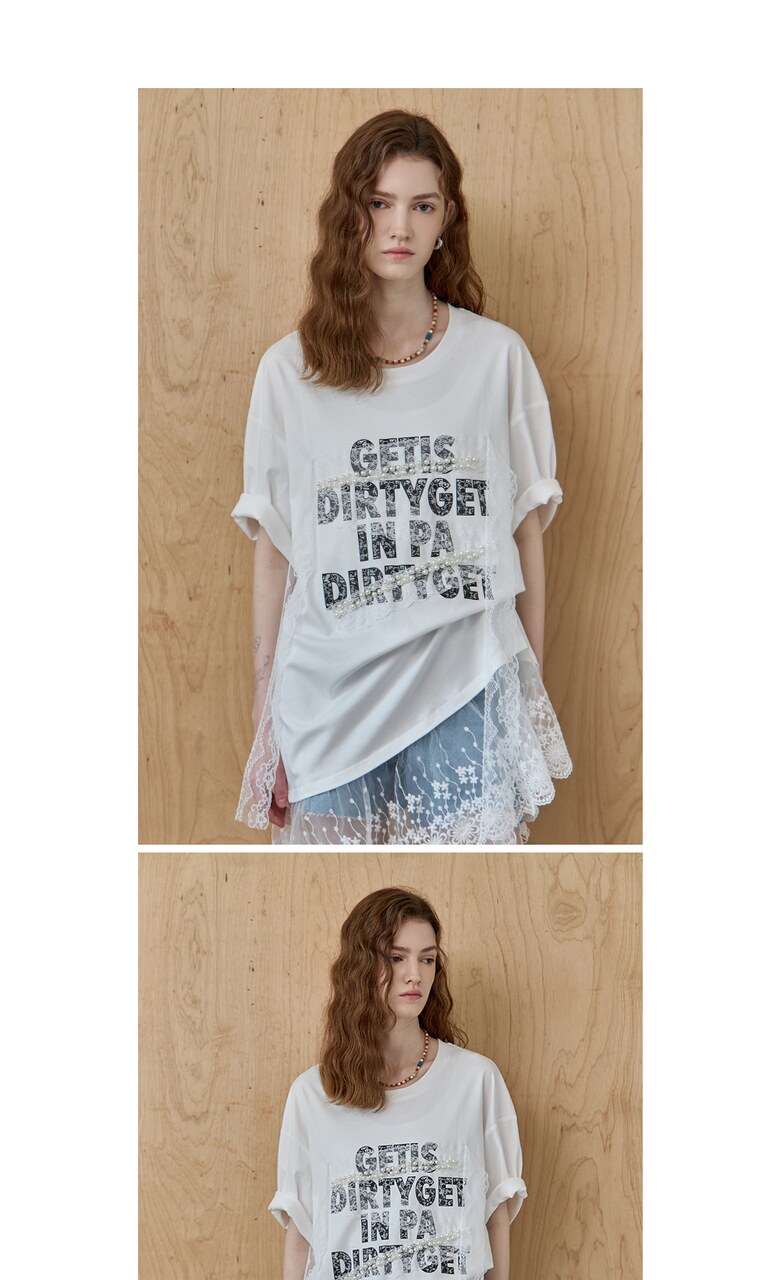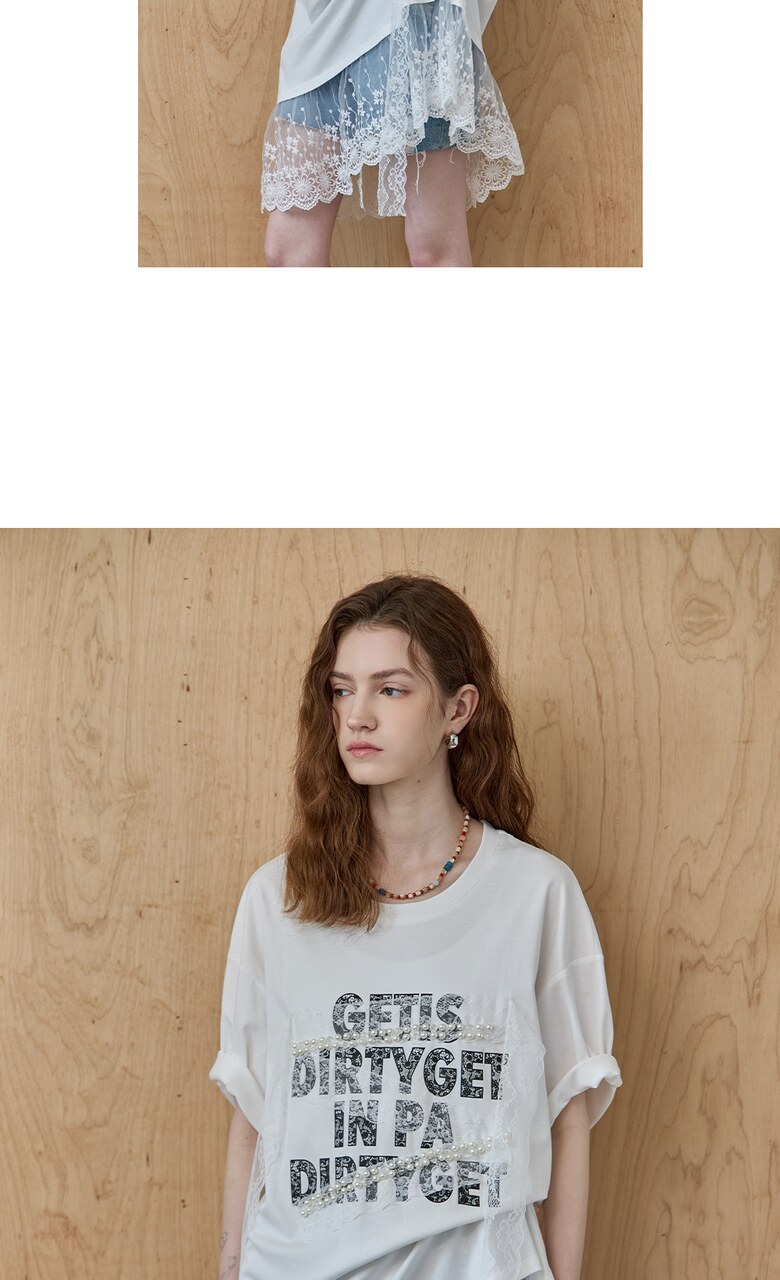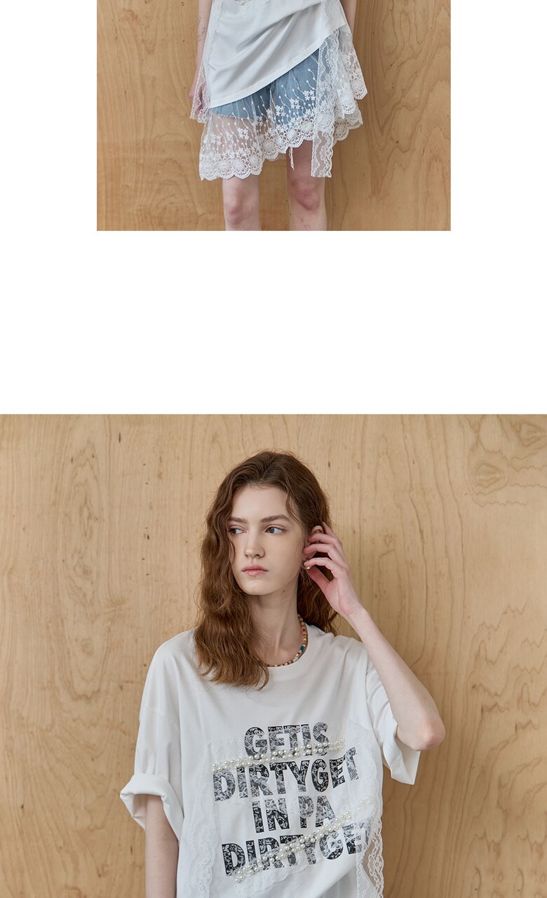 레터링 진주장식 레이스 레이어드 롱 티셔츠