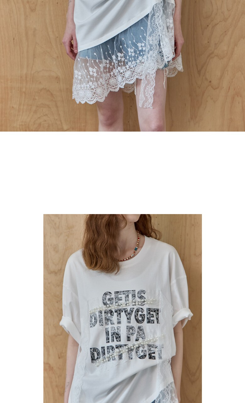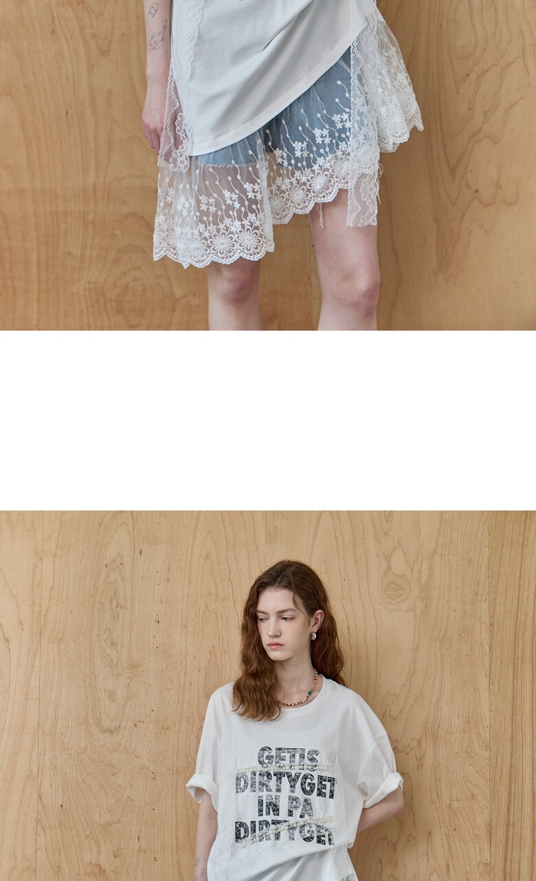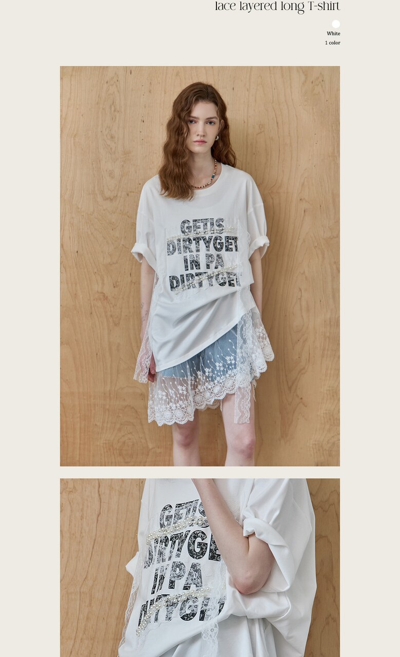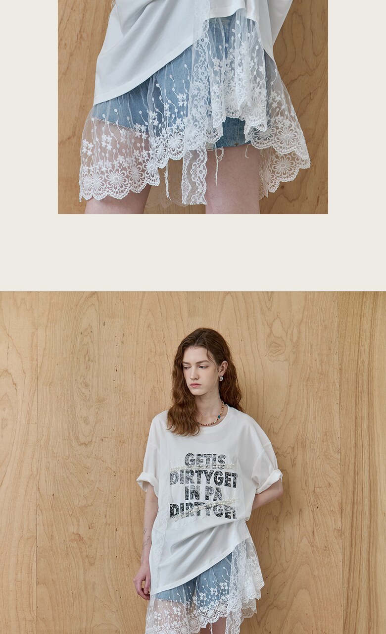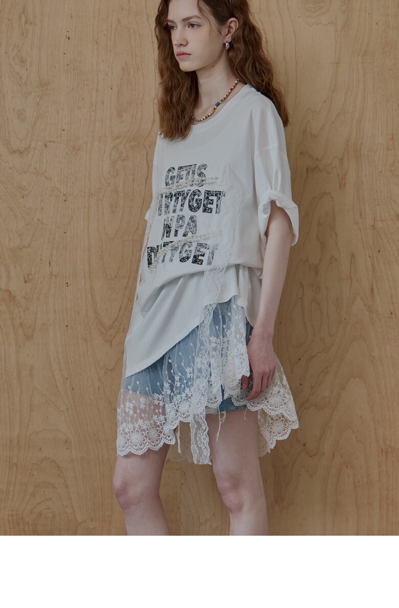레터링 진주장식 레이스 레이어드 롱 티셔츠