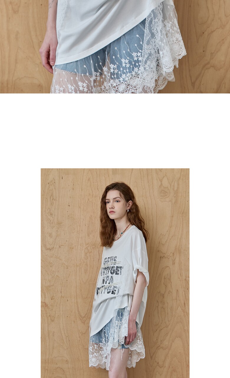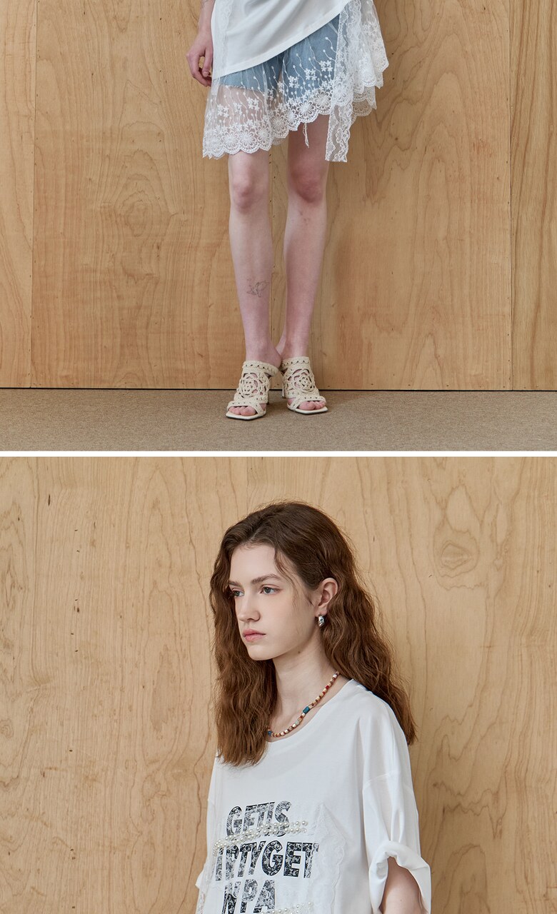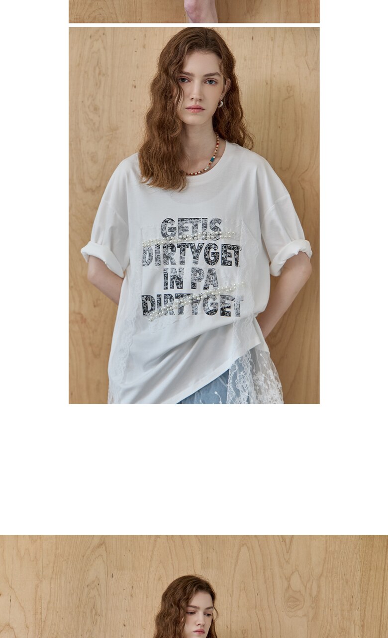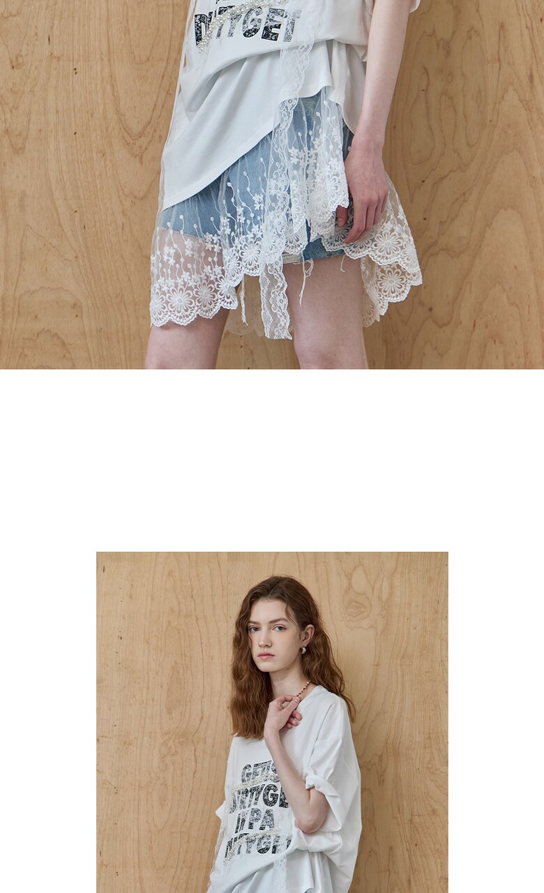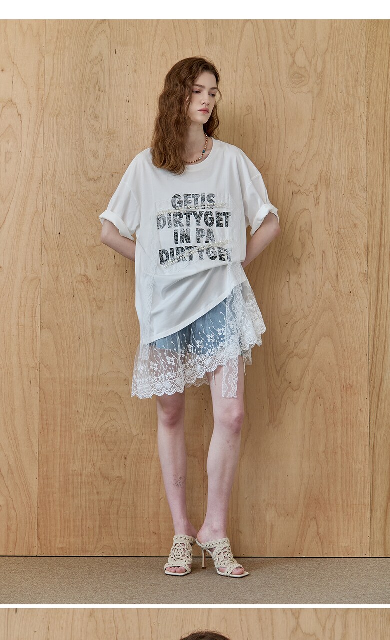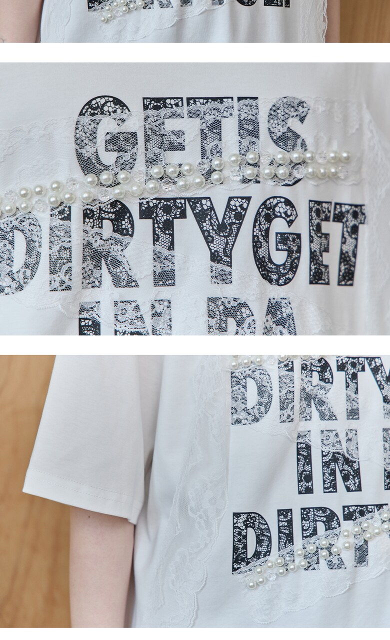 레터링 진주장식 레이스 레이어드 롱 티셔츠