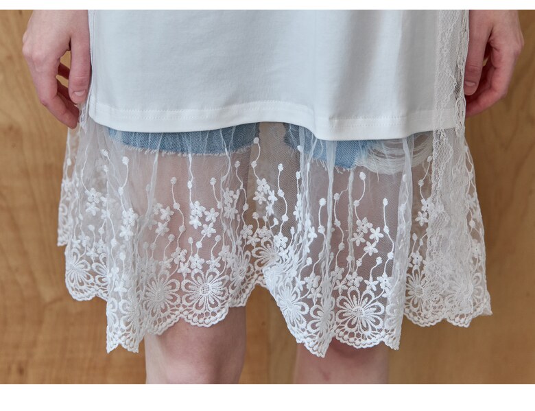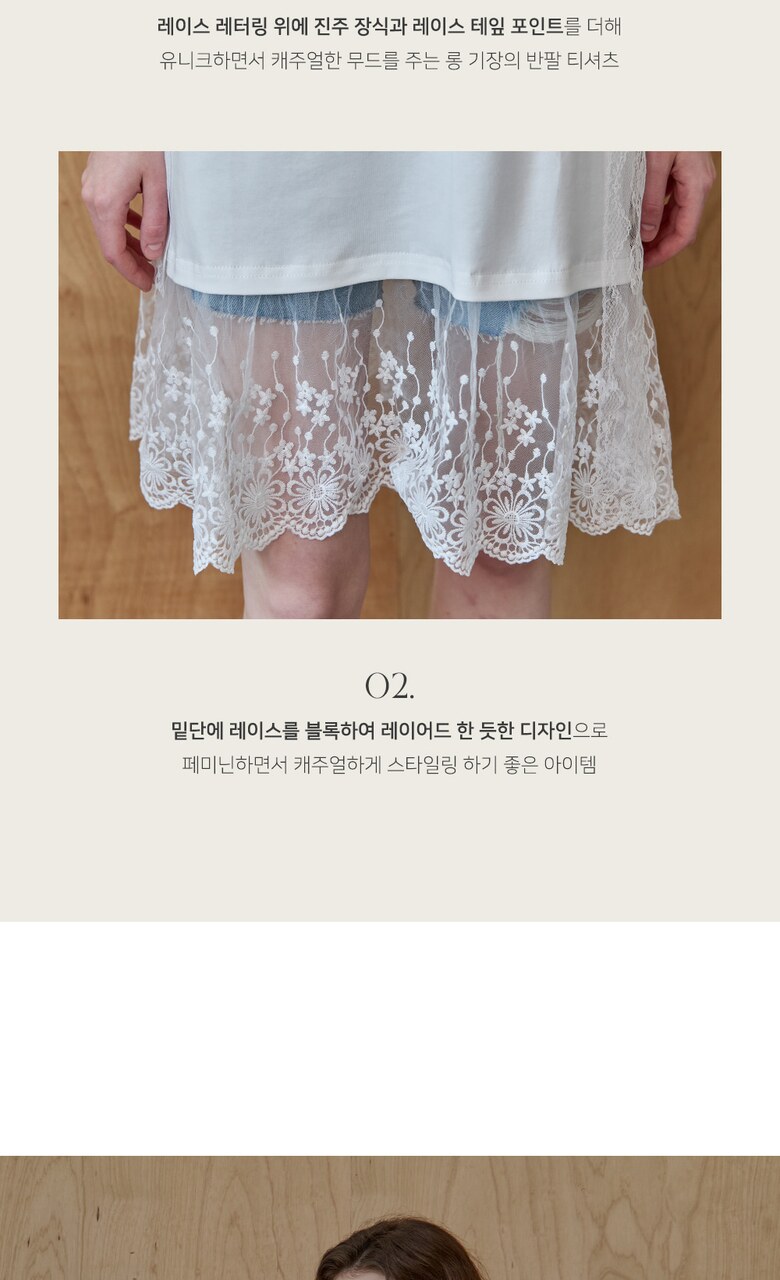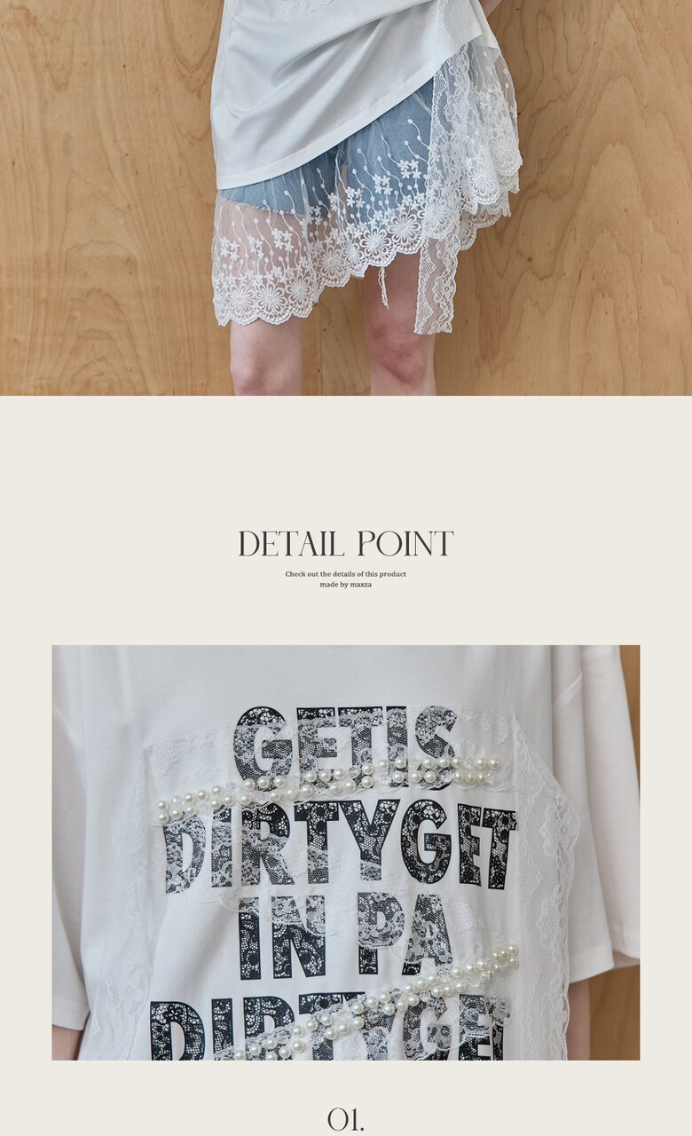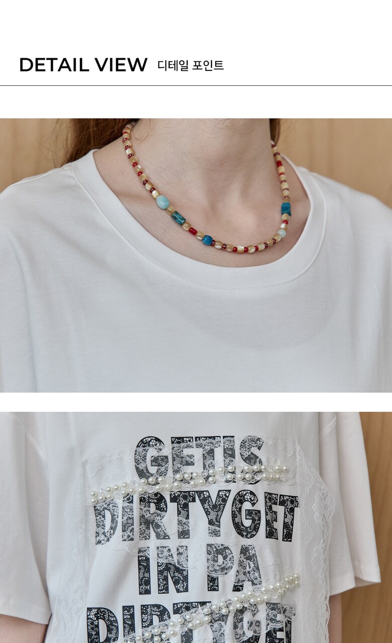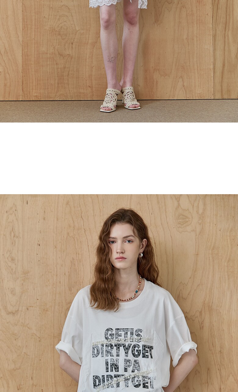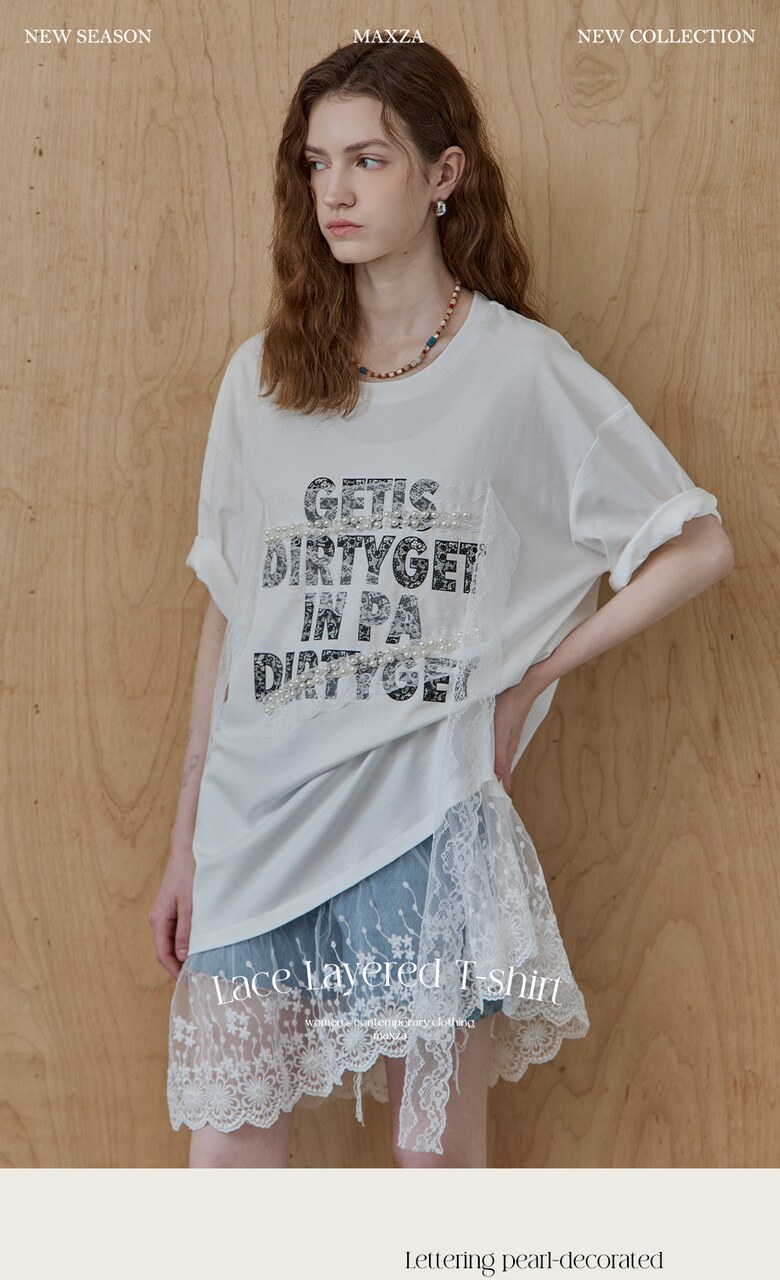 레터링 진주장식 레이스 레이어드 롱 티셔츠