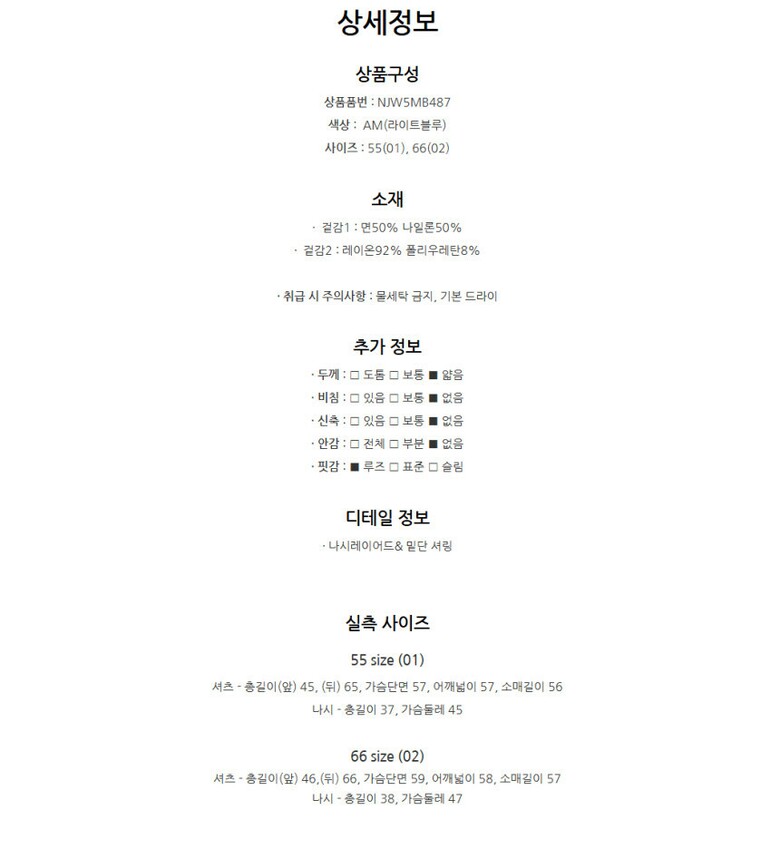 | 1. 제품 소재 (섬유의 조성 또는 혼용률을 백분율로 표시, 기능성인 경우 성적서 또는 허가서) | 겉감1:면 50%, 나일론 50%, 겉감2:레이온 92%, 폴리우레탄 8% |