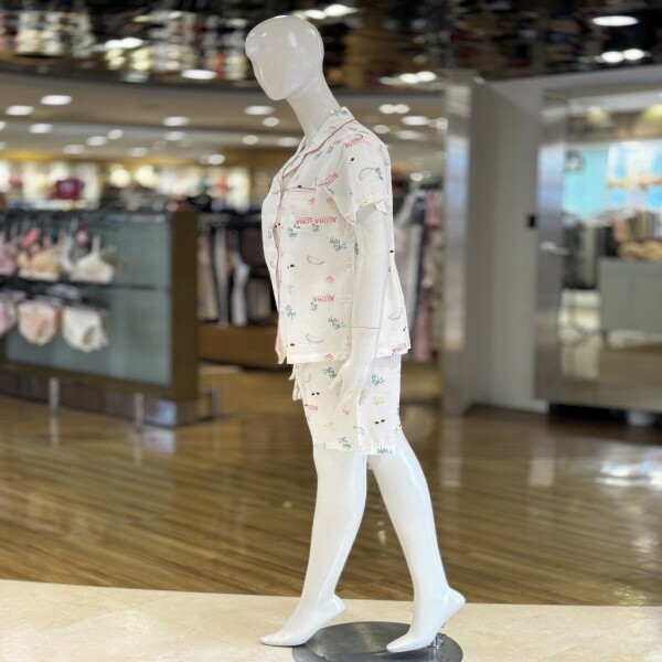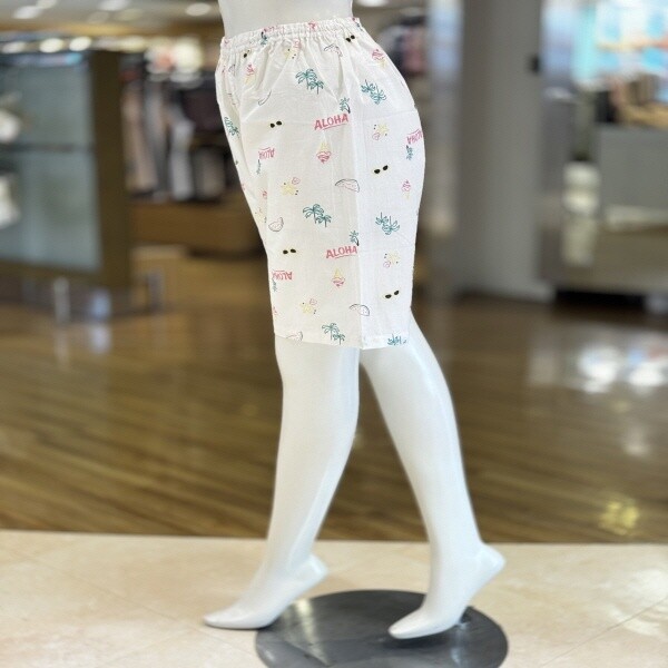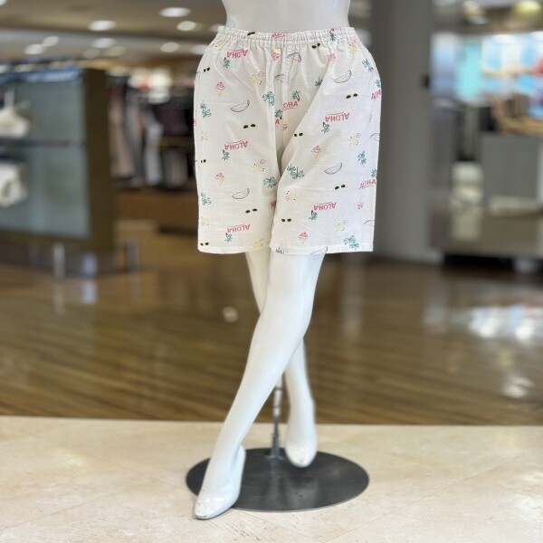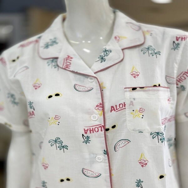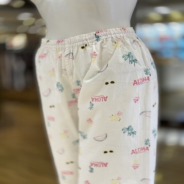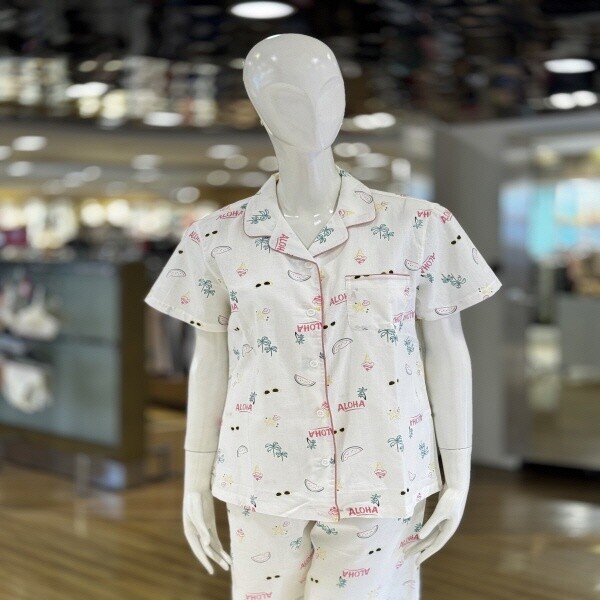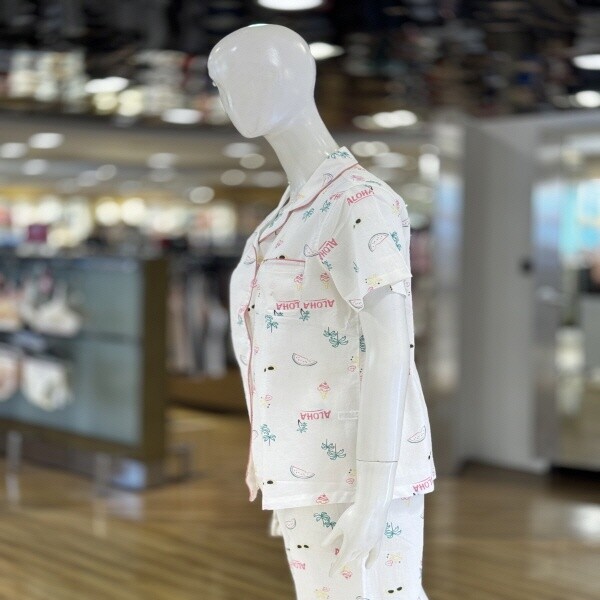 깔끔한 화이트 색상을 바탕으로 귀여운 하와이 느낌의 패턴을 넣어?화사하고 귀여운 느낌의 여성 잠옷세트예요!