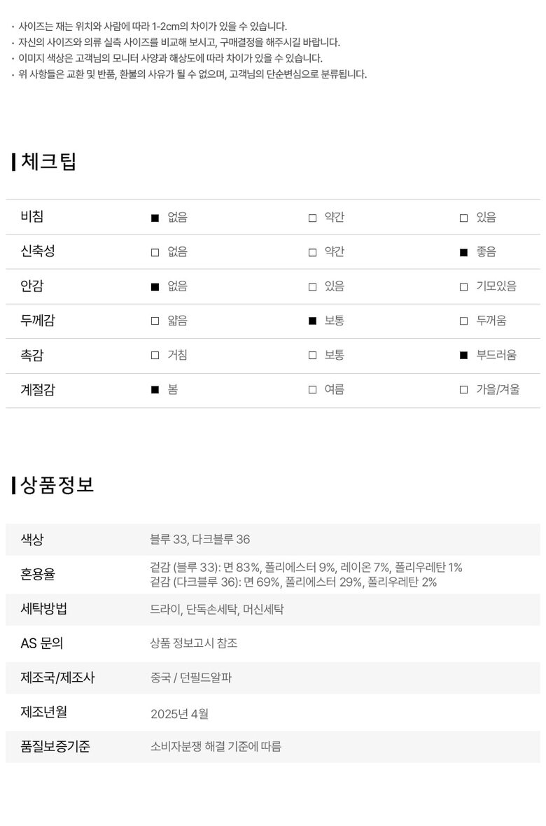 제품소재 : 블루(33)-면83%,폴리에스터9%,레이온7%,폴리우레탄1%다크블루(36)-면69%,폴리에스터29%,폴리우레탄2%