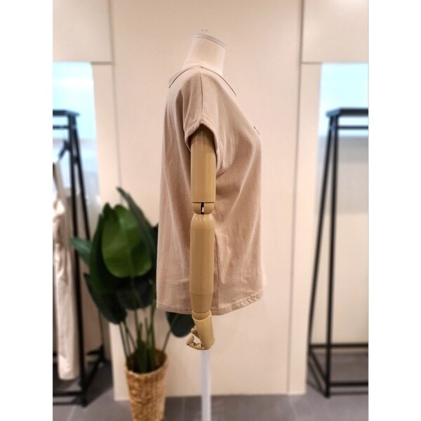 면 소재의 민소매 티셔츠입니다.어깨선이 살짝 내려온 캡소매 디자인으로 부담스럽지 않습니다.