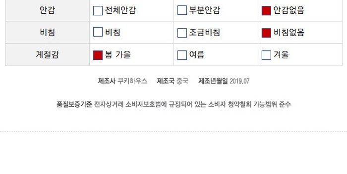 1. 제품 소재 (섬유의 조성 또는 혼용률을 백분율로 표시, 기능성인 경우 성적서 또는 허가서) | 상세페이지참조 |