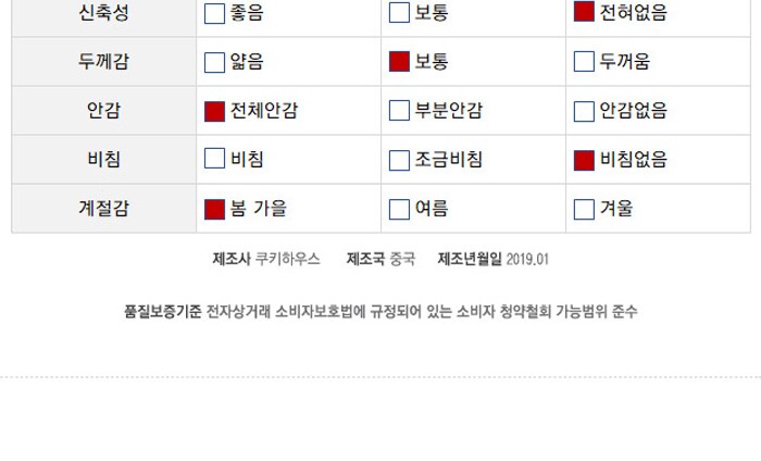 1. 제품 소재 (섬유의 조성 또는 혼용률을 백분율로 표시, 기능성인 경우 성적서 또는 허가서) | 상세페이지참조 |