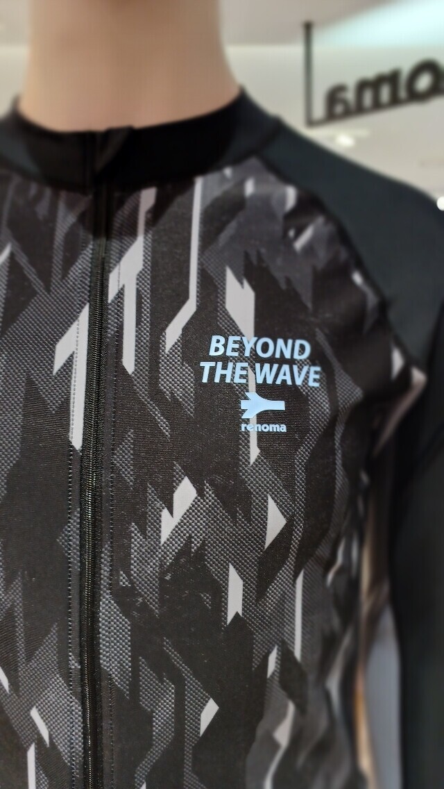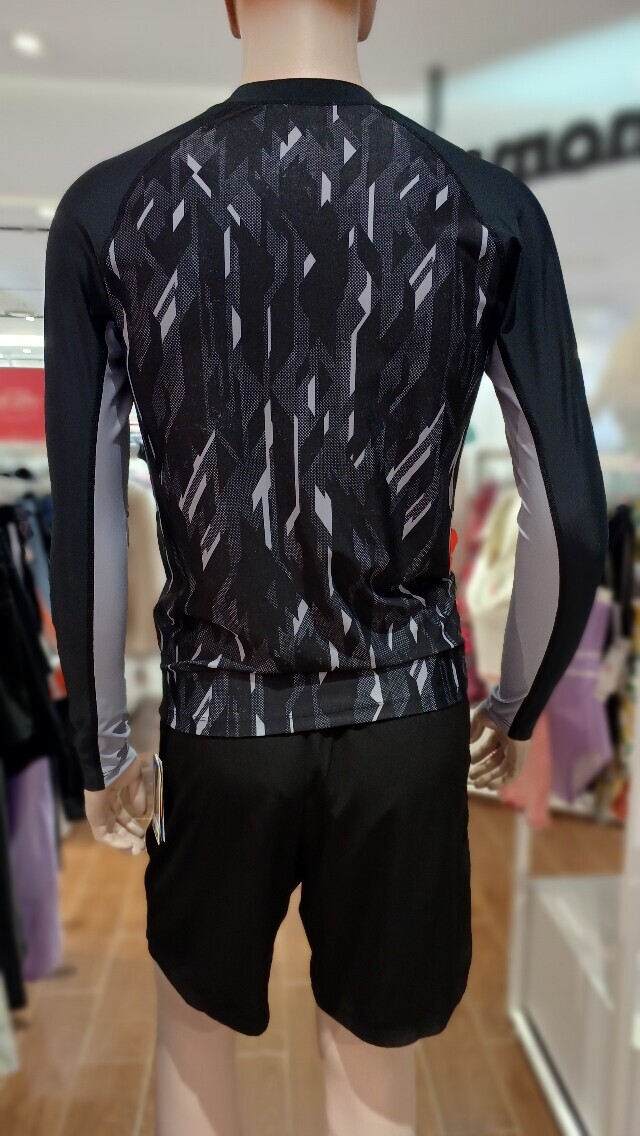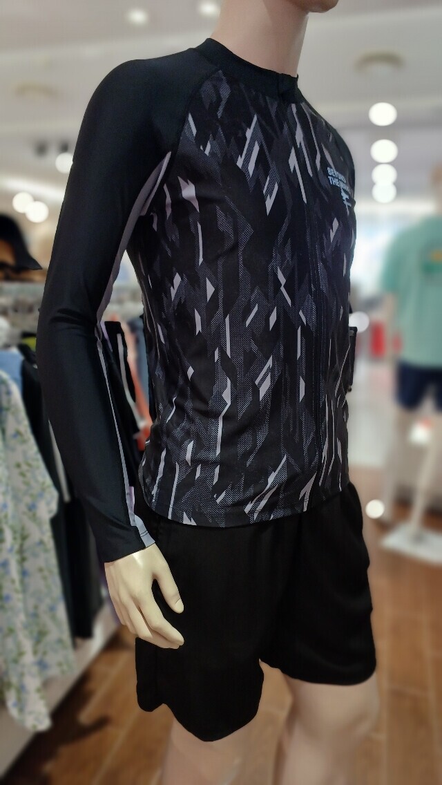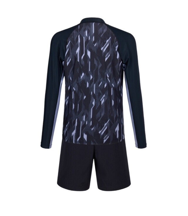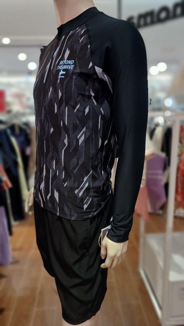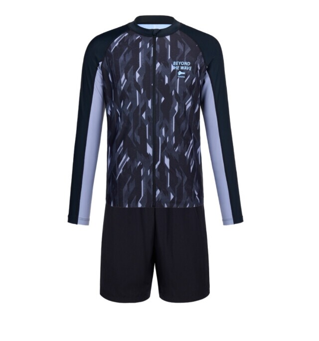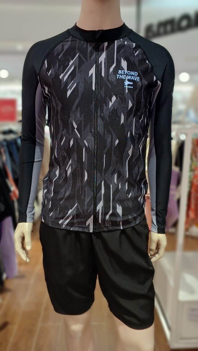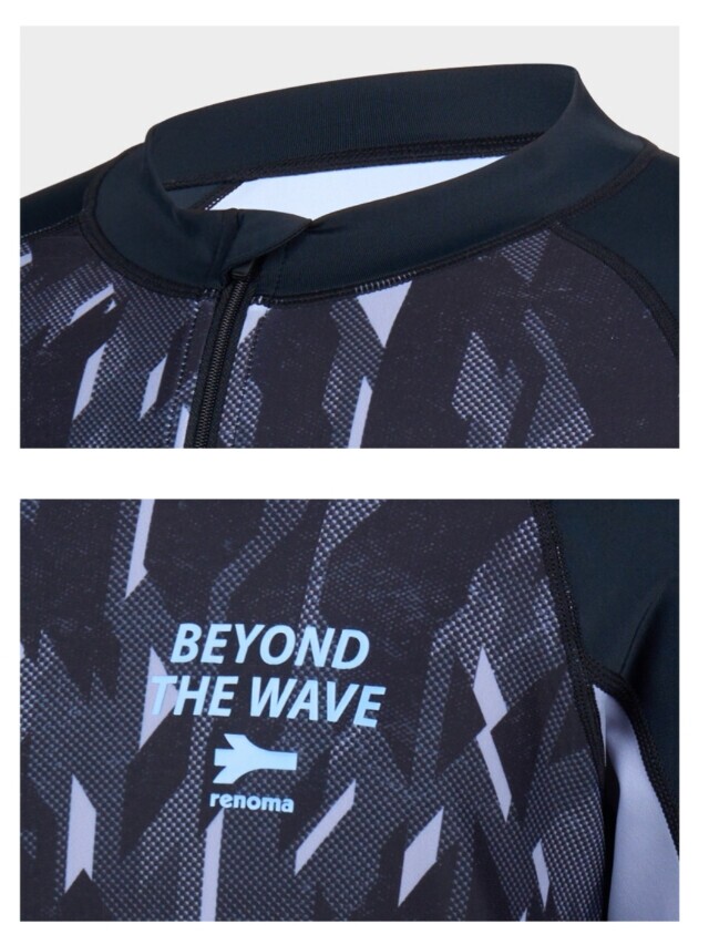 톤온톤 기하학 패턴이 포인트이며 이너팬티 내장되어 편하게 착용 가능한 기본 핏 집업래쉬가드입니다.