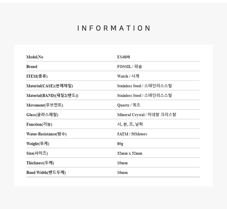 | 7. 주요 사양 | 스테인리스스틸 시계 쿼츠 |