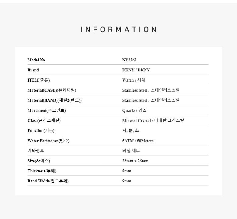 | 1. 소재 / 순도 / 밴드재질 | 실버/ 케이스 - 스테인리스스틸 / 밴드 - 스테인리스스틸 |