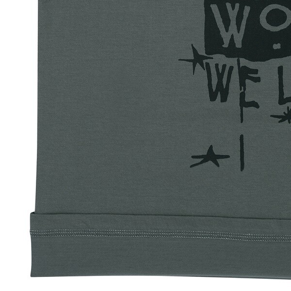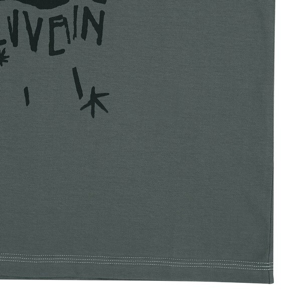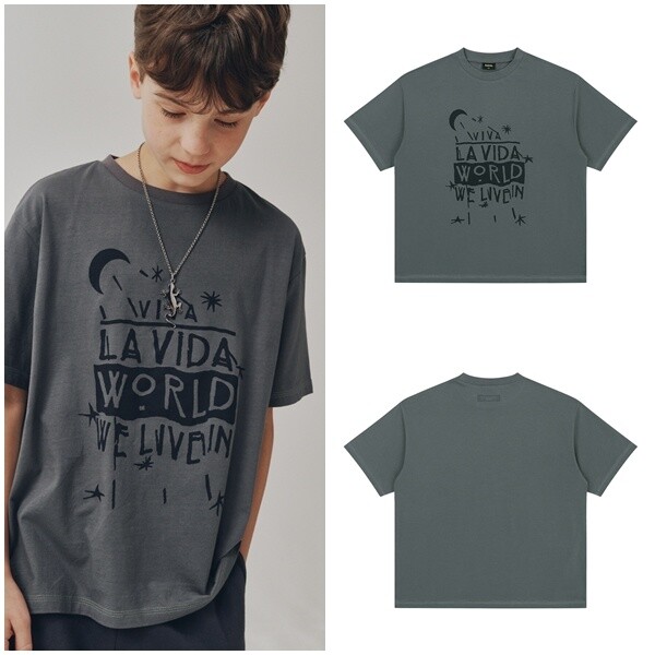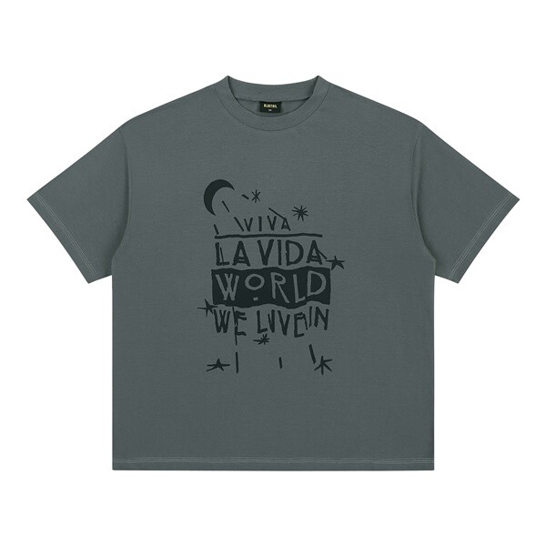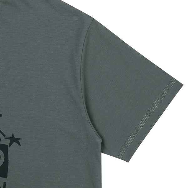 넉넉한 상동의 오버핏 다크 카키 컬러 반팔 티셔츠입니다. 히피 감성의 레터링 나염과 소매 끝과 밑단에 3줄 민트 스티치로 컬러 포인트를 준 상품입니다.