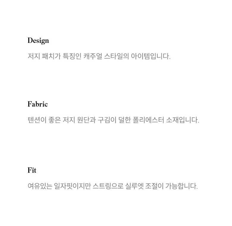 | 1. 제품 소재 (섬유의 조성 또는 혼용률을 백분율로 표시, 기능성인 경우 성적서 또는 허가서) | 상품상세참조 |