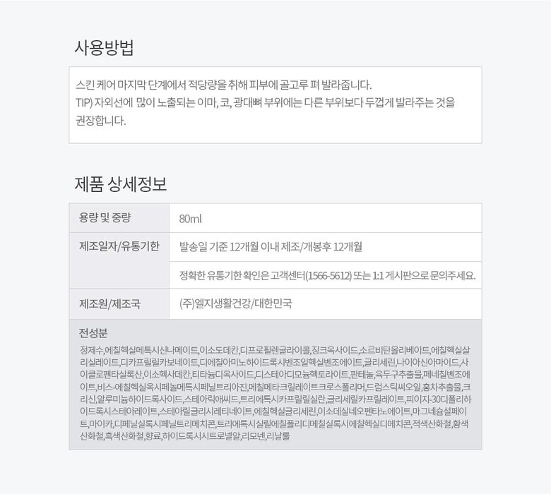 | 9. 사용 시 주의사항 | 1. 화장품을 사용 중 붉은 반점, 부어오름, 가려움증, 자극 등의 이상이 있는 경우, 적용 부위가 직사광선에 의하여 이상이 생긴 경우 사용을 중지하시고 피부과 전문의와 상담하세요. 2. 상처가 있는 부위, 습진 및 피부염 등의 이상이 있는 부위에는 사용하지 마세요. 117. 보관 및 취급시 주의사항 가)사용 후에는 반드시 마개를 닫아두세요. 나)유아ㆍ소아의 손이 닿지 않는 곳에 보관하세요. 다)고온 다습한 곳 및 직사광선 닿는 장소는 피해주세요. |