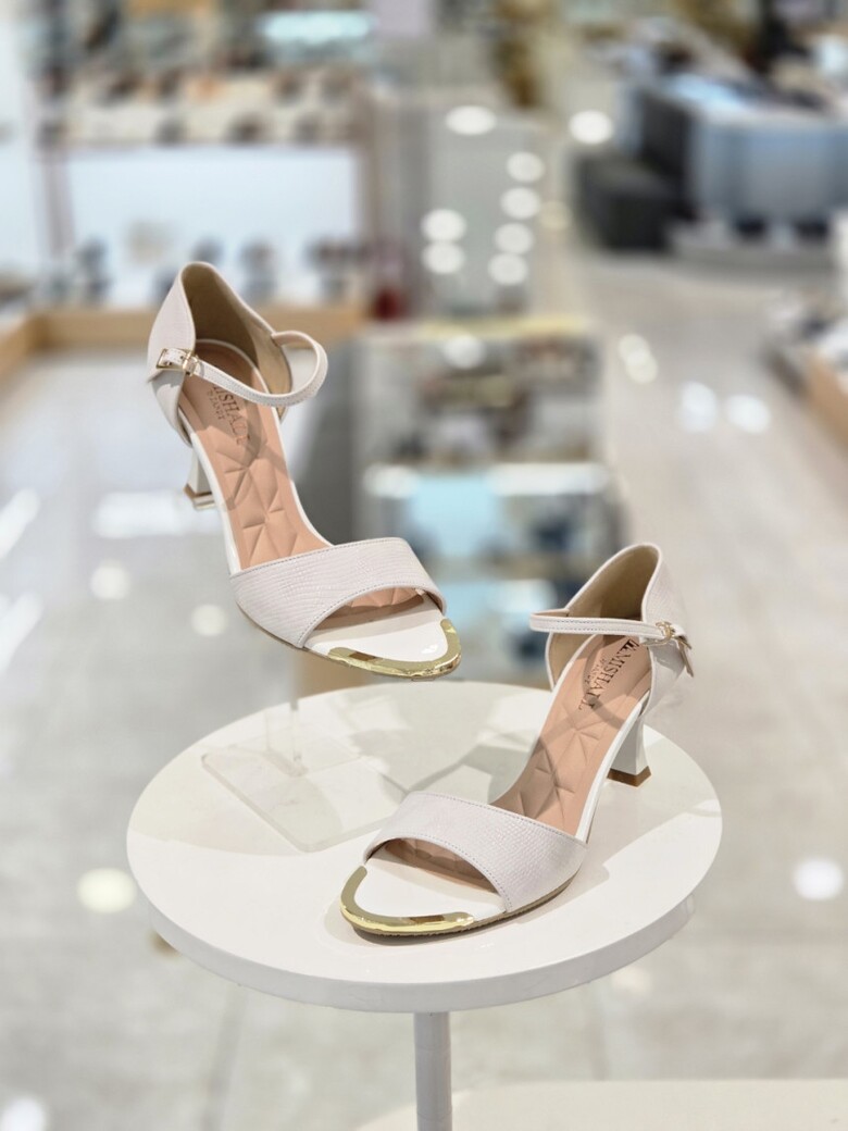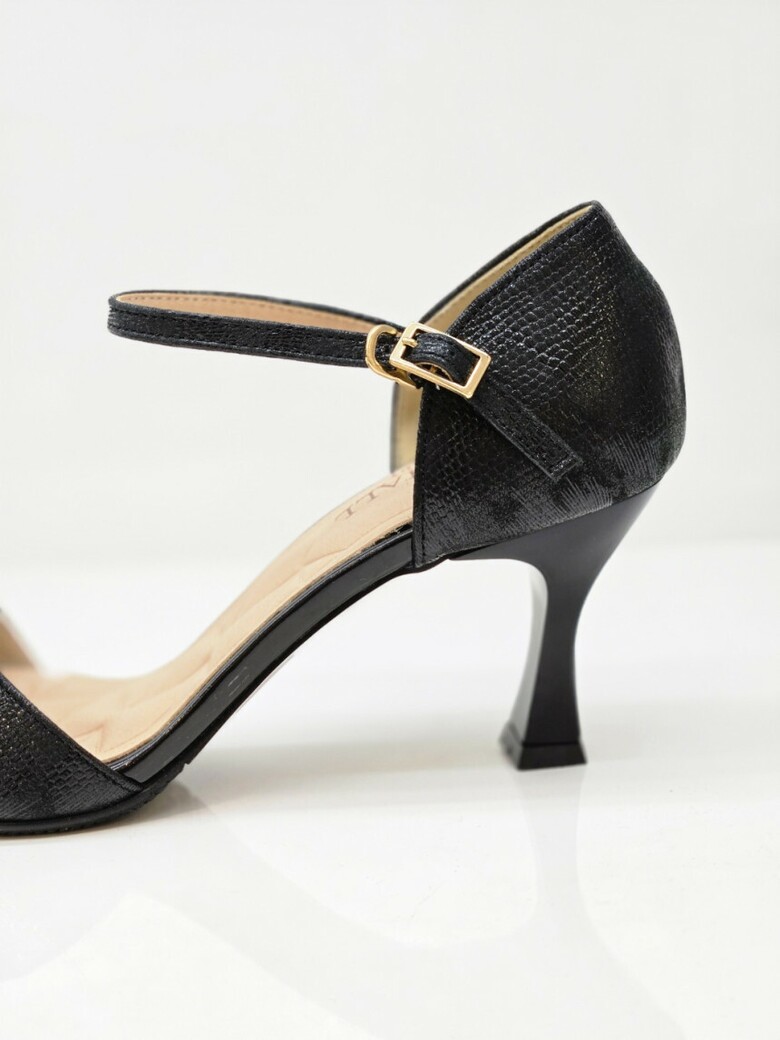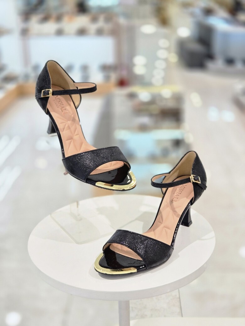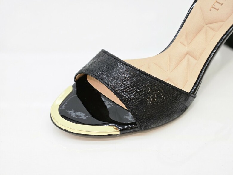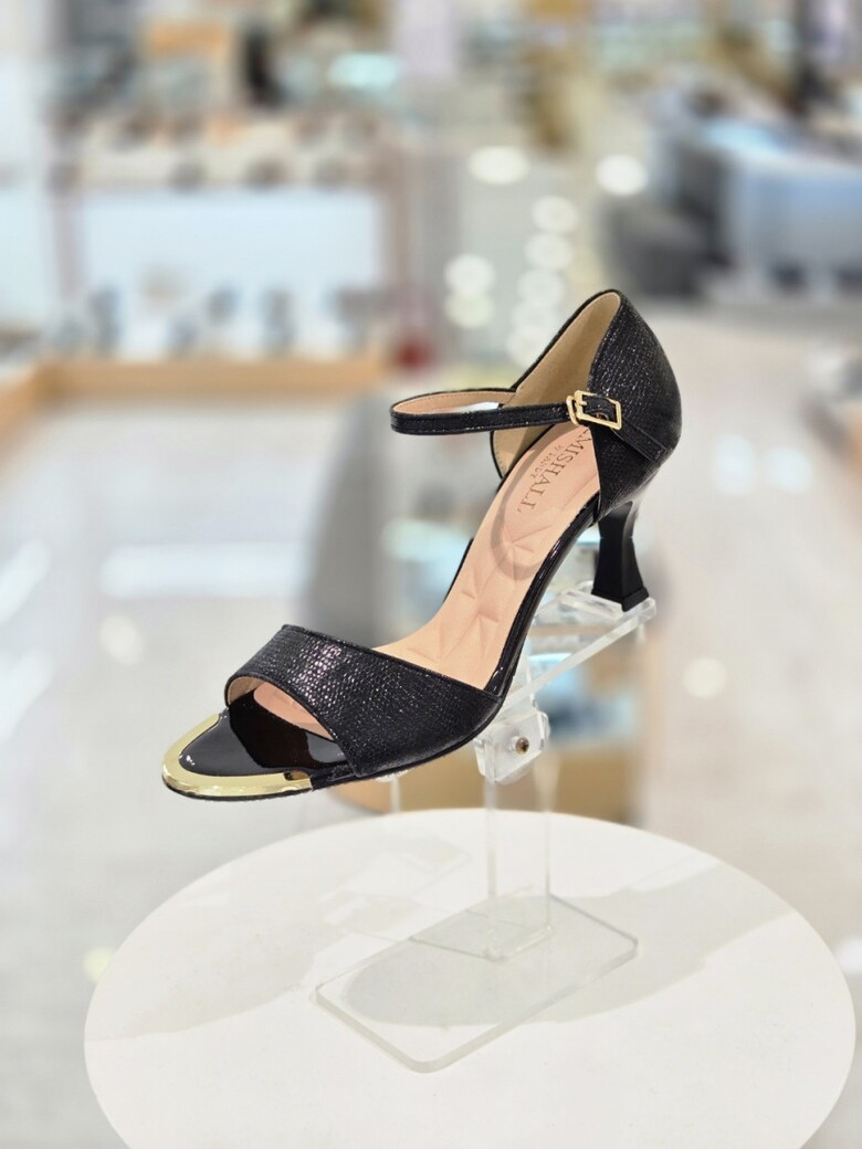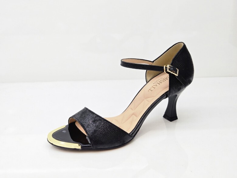 발목 스트랩 스타일에 앞코 금색 골드장식으로 포인트주어