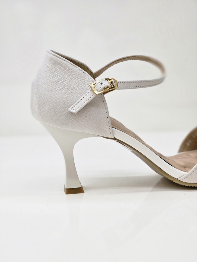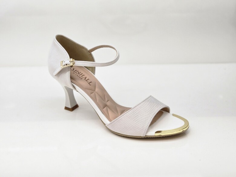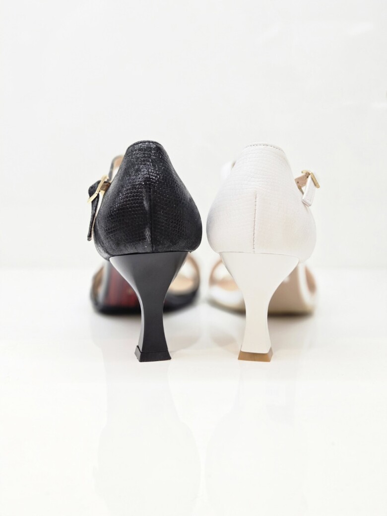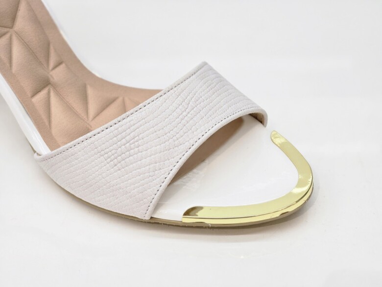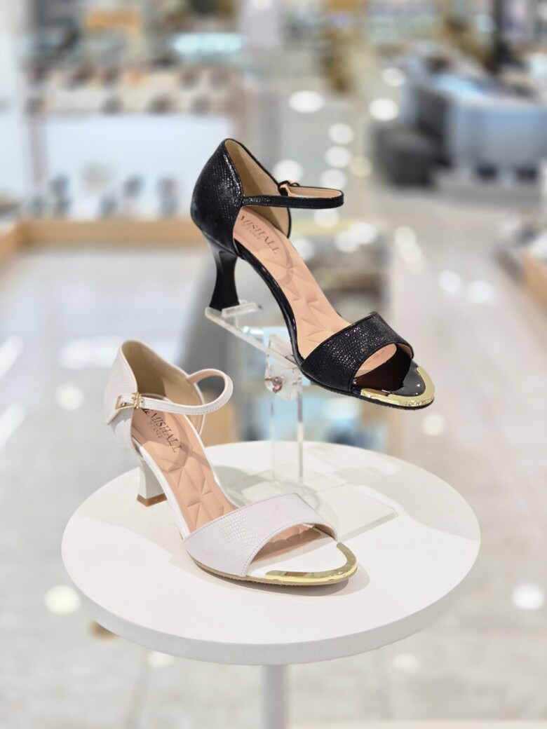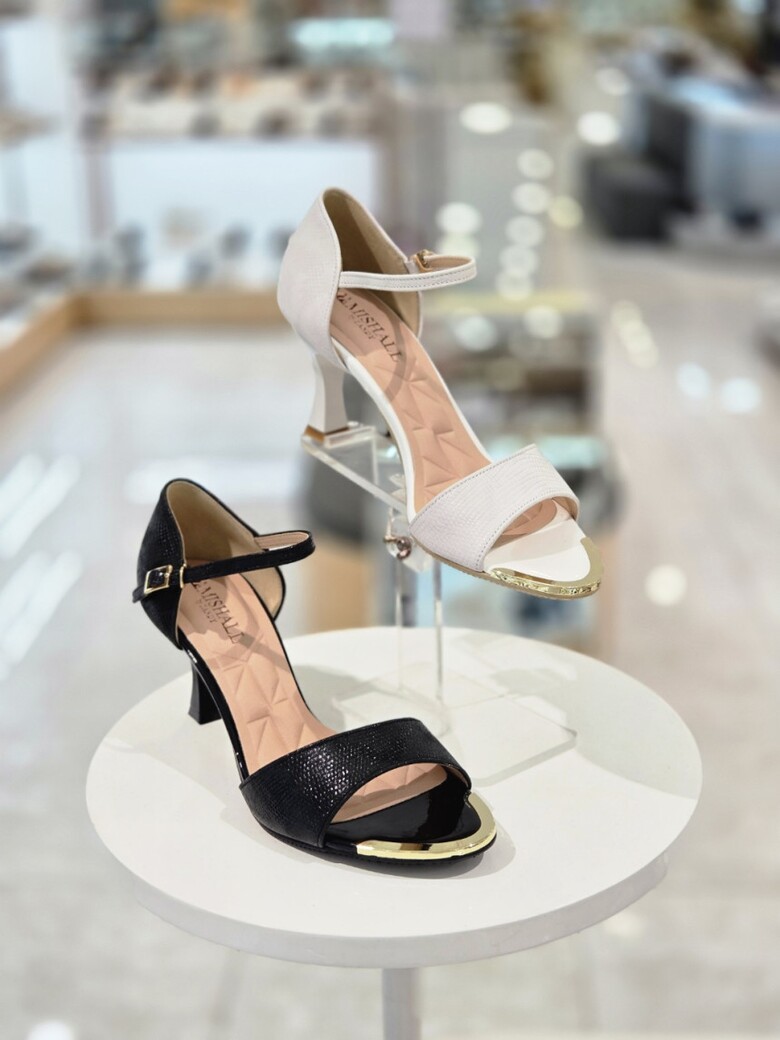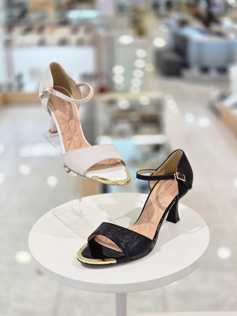발목 스트랩 스타일에 앞코 금색 골드장식으로 포인트주어