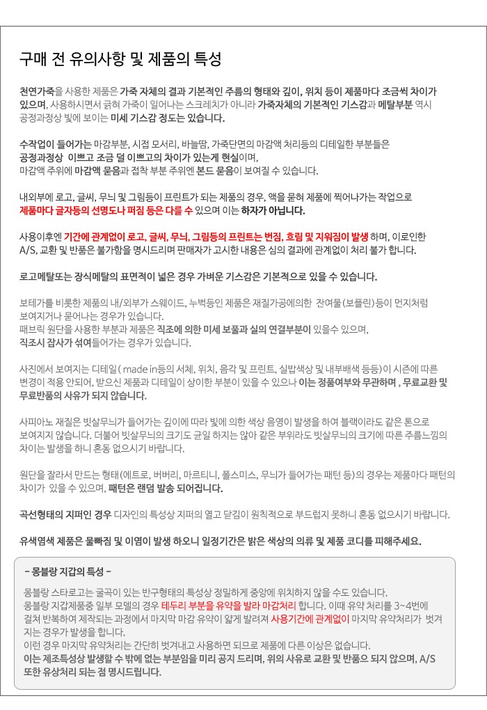 세탁 및 취급방법 세탁불가(부드럽고 마른천으로 먼지만 관리) 사용 및 보관시 고온, 습기(빗물, 체습 등), 직사광 및 마찰등으로 변형, 변색이 될수 있으니 주의바라며 물기를 접했을땐 부드럽고 마른천으로 톡톡두드려 흡수 후 서늘한 그늘에 말려주세요