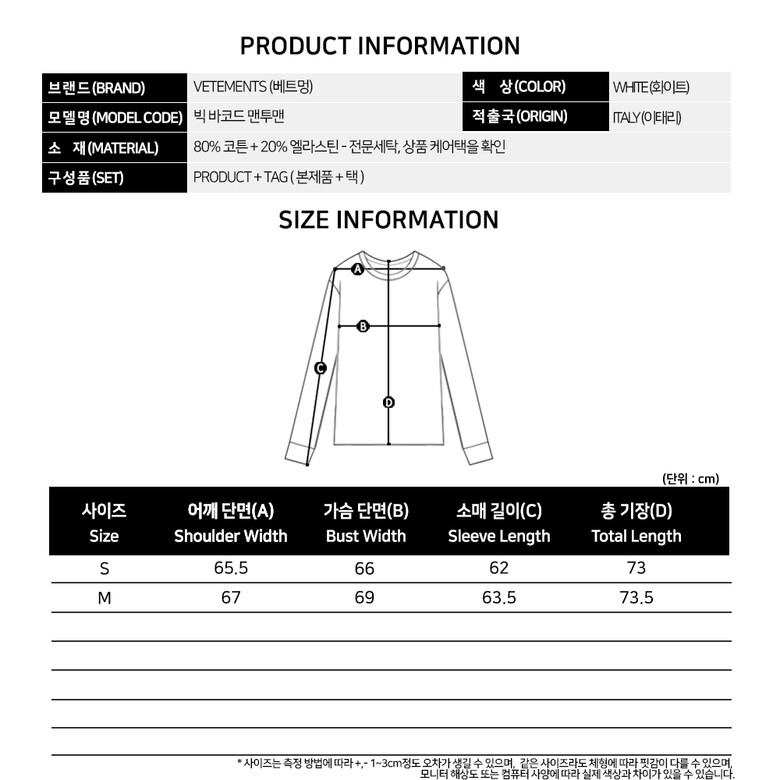 [명품] 베트멍 22SS 빅 바코드 화이트 맨투맨 VL12TR100W WHITE