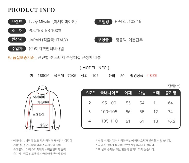 | 1. 제품 소재 (섬유의 조성 또는 혼용률을 백분율로 표시, 기능성인 경우 성적서 또는 허가서) | 상세페이지 참조 |