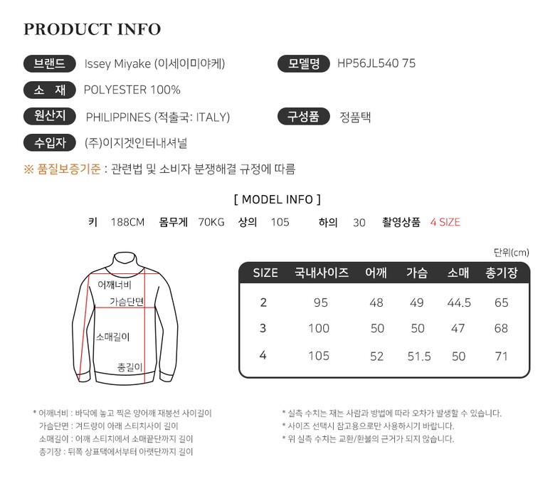 | 1. 제품 소재 (섬유의 조성 또는 혼용률을 백분율로 표시, 기능성인 경우 성적서 또는 허가서) | 상세페이지 참조 |