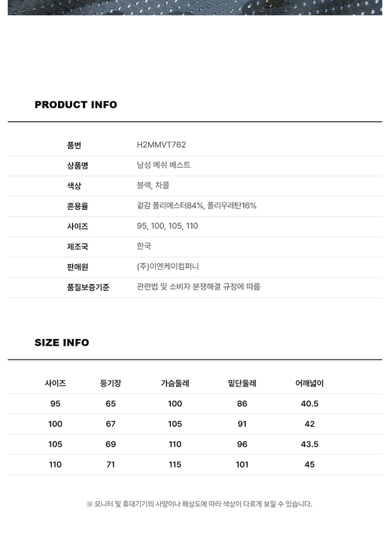| 1. 제품 소재 (섬유의 조성 또는 혼용률을 백분율로 표시, 기능성인 경우 성적서 또는 허가서) | 상세설명참고 |