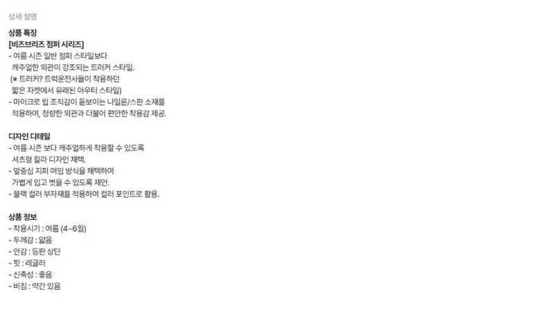 | 1. 제품 소재 (섬유의 조성 또는 혼용률을 백분율로 표시, 기능성인 경우 성적서 또는 허가서) | 상품상세참조 |