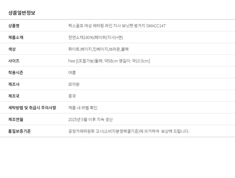 3. 치수 | free둘레: 약58cm 챙길이: 약8.5cm) |